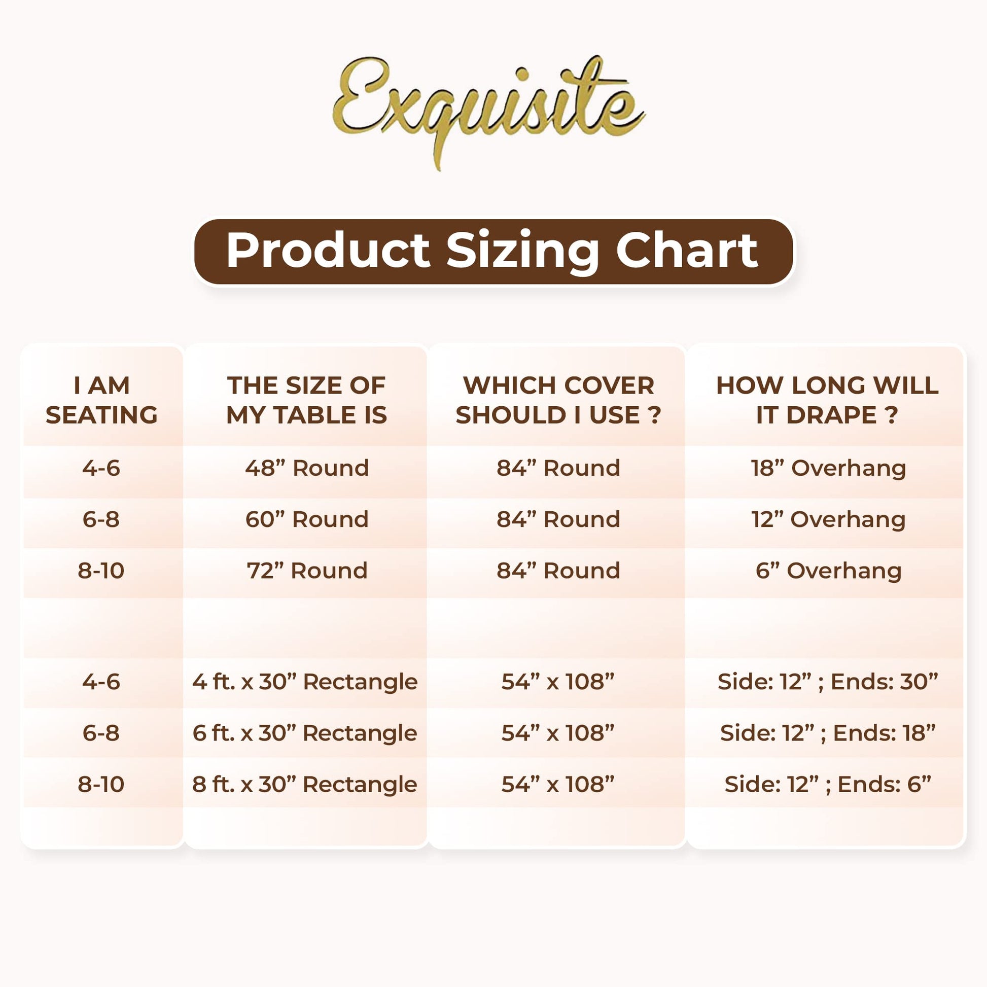 - SIZE: This 54" x 108" Brown Plastic tablecloth will cover any table up to 8 feet.