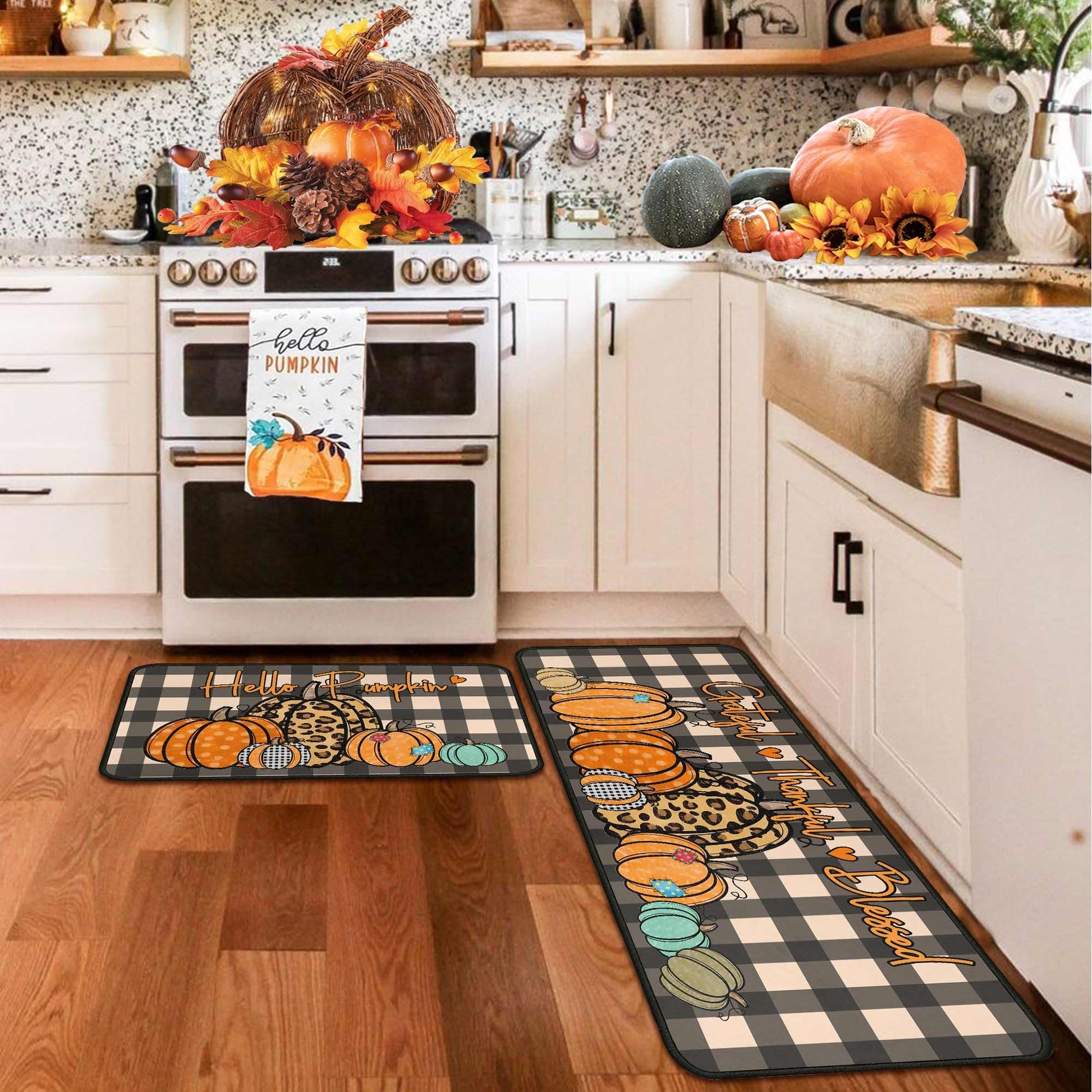 - Non-Slip Kitchen Floor Mat Set: Our fall kitchen rugs designed with non skid latex backing, offer strong skid resistance to prevent shifting, slipping or tripping, provide safety for your family. Never worry about the rug slipping, or dangers! The non slip backing is easy to clean and will not scratch floors!