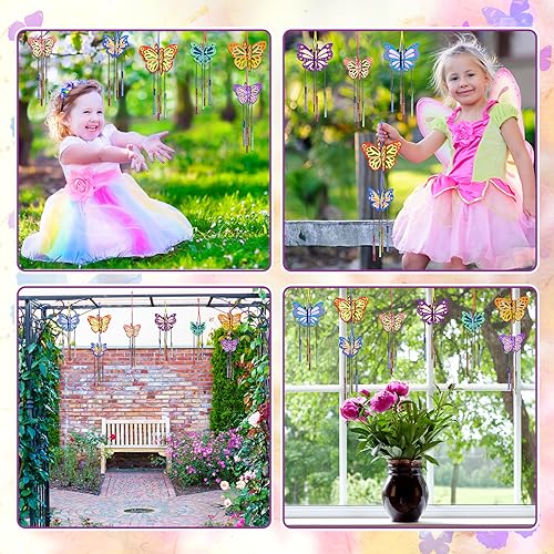 - DIY Wind Chime Kit:Our DIY wind chimes kit for kids include 16x unfinishedn wooden 3D butterfly(includes 4 shapes, 4 large , 4 small , 4 hollowed large , 4 hollowed small ),32x wind chime tubes(4 colors, 8 for each color),2x paiting brushes(there no paint included),8x 1M silver wire,8x color rope,1x rhinestone stickers.Our butterfly wind chime adopts the 3D design, which looks even more vivid! Various styles to meet your decorative needs,kids can make their own wind chime kit.