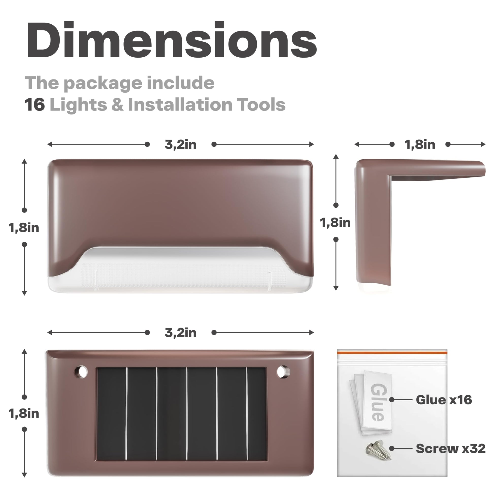 - Worry-Free Shopping. The package includes 16 lights, 32 screws, 16 glues, and a user manual for a hassle-free shopping experience. The solar lights provide a worry-free and cost-effective lighting solution for your outdoor space. With automatic turn-on at dusk and turn-off at dawn, they are both energy-efficient and environmentally friendly.