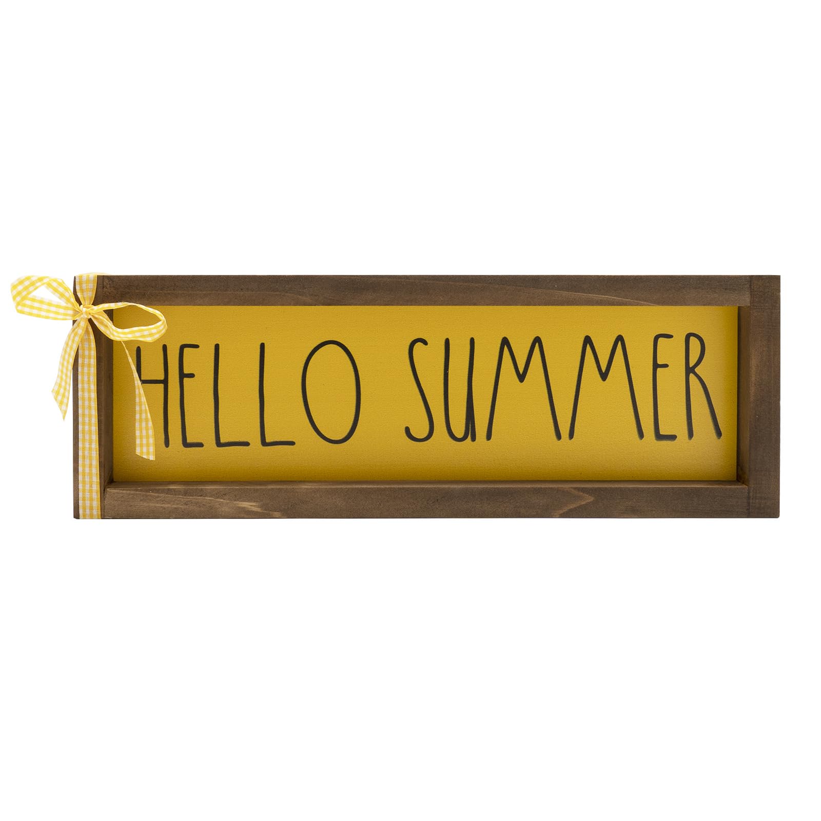 Details: A yellow background with black "HELLO SUMMER" lettering and a black and white check ribbon tied in the corner gives you a sense of summertime. Sits up easy or you can hang on wall. Perfect to brighten up the house a little for summer, Super cute.