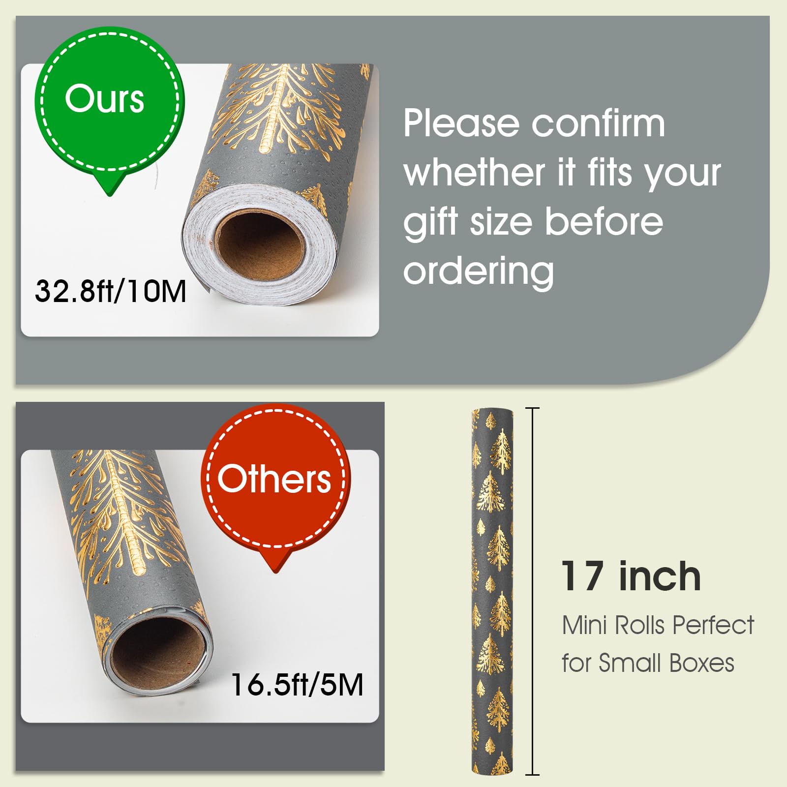 - Size: The Christmas tree design gift wrap measure 17 inch wide and 32.8 feet long.In order to facilitate the gift to be wrapped in larger paper, we have adjusted the size. Please confirm whether it fits your gift size before ordering