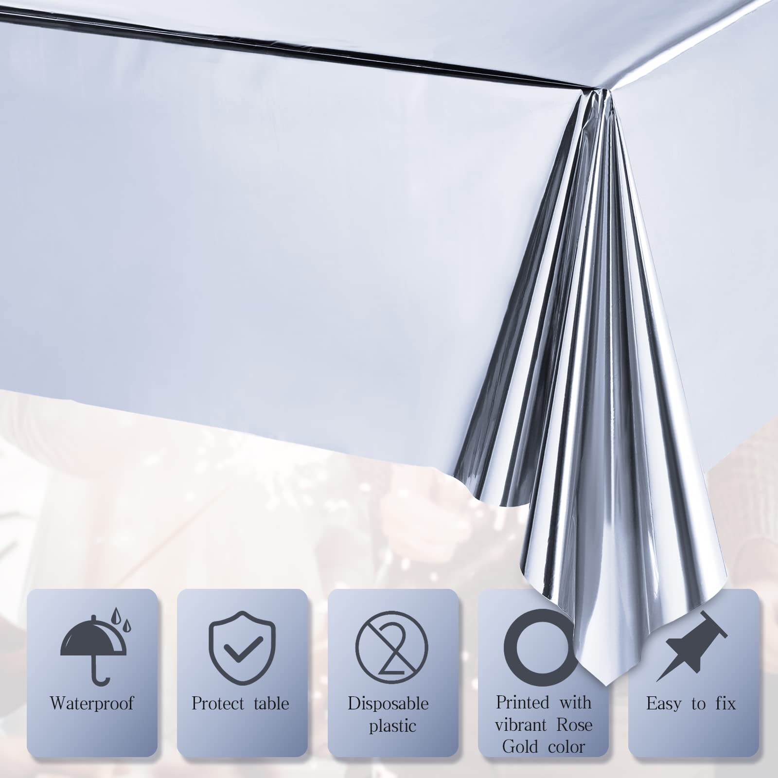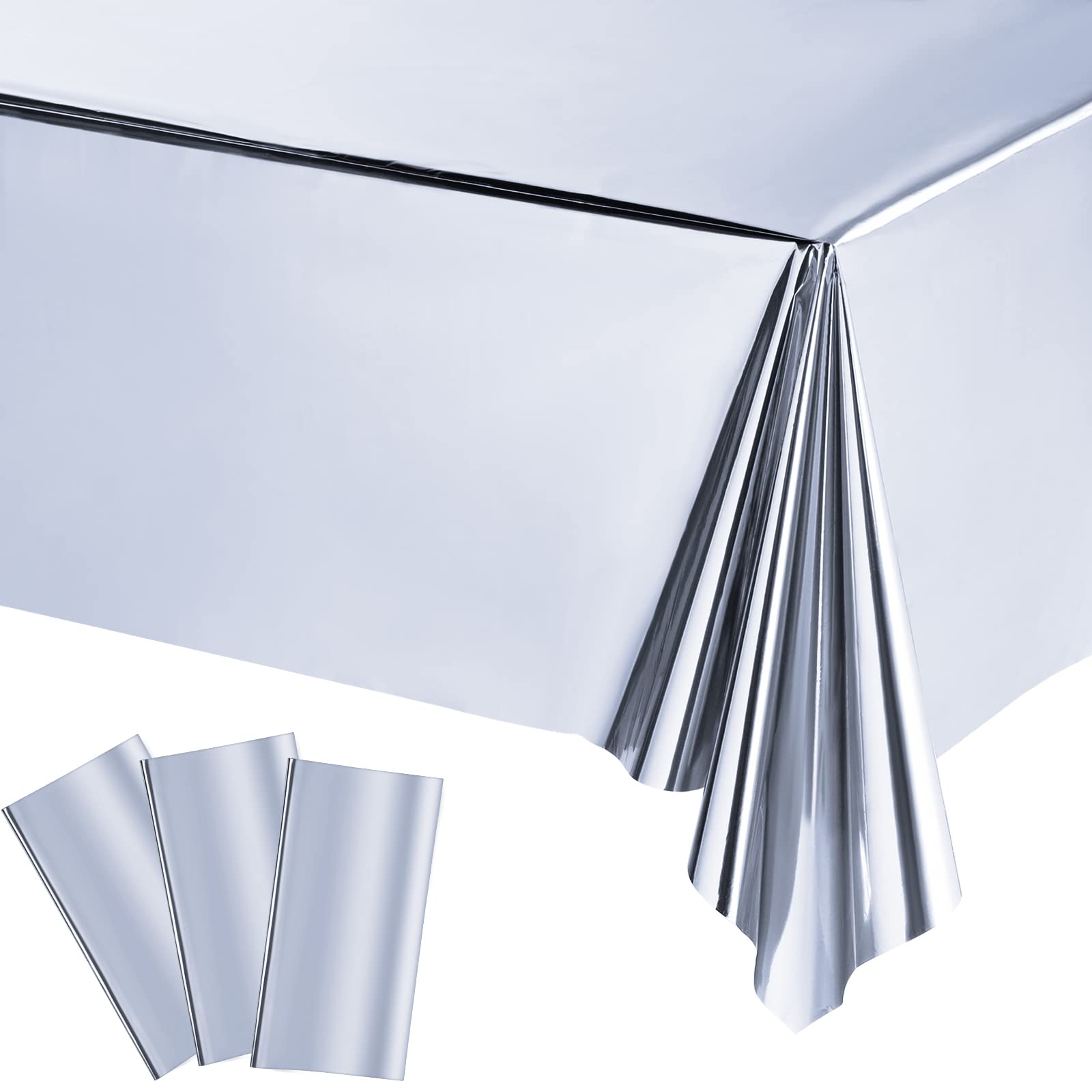 Foil Party Rectangular Table Covers Table Cloth 54 x 108 Inch Shiny Plastic Waterproof Tablecloth Party Table Cover for Wedding Anniversary Engagement Party (Silver, 3 Pieces)
