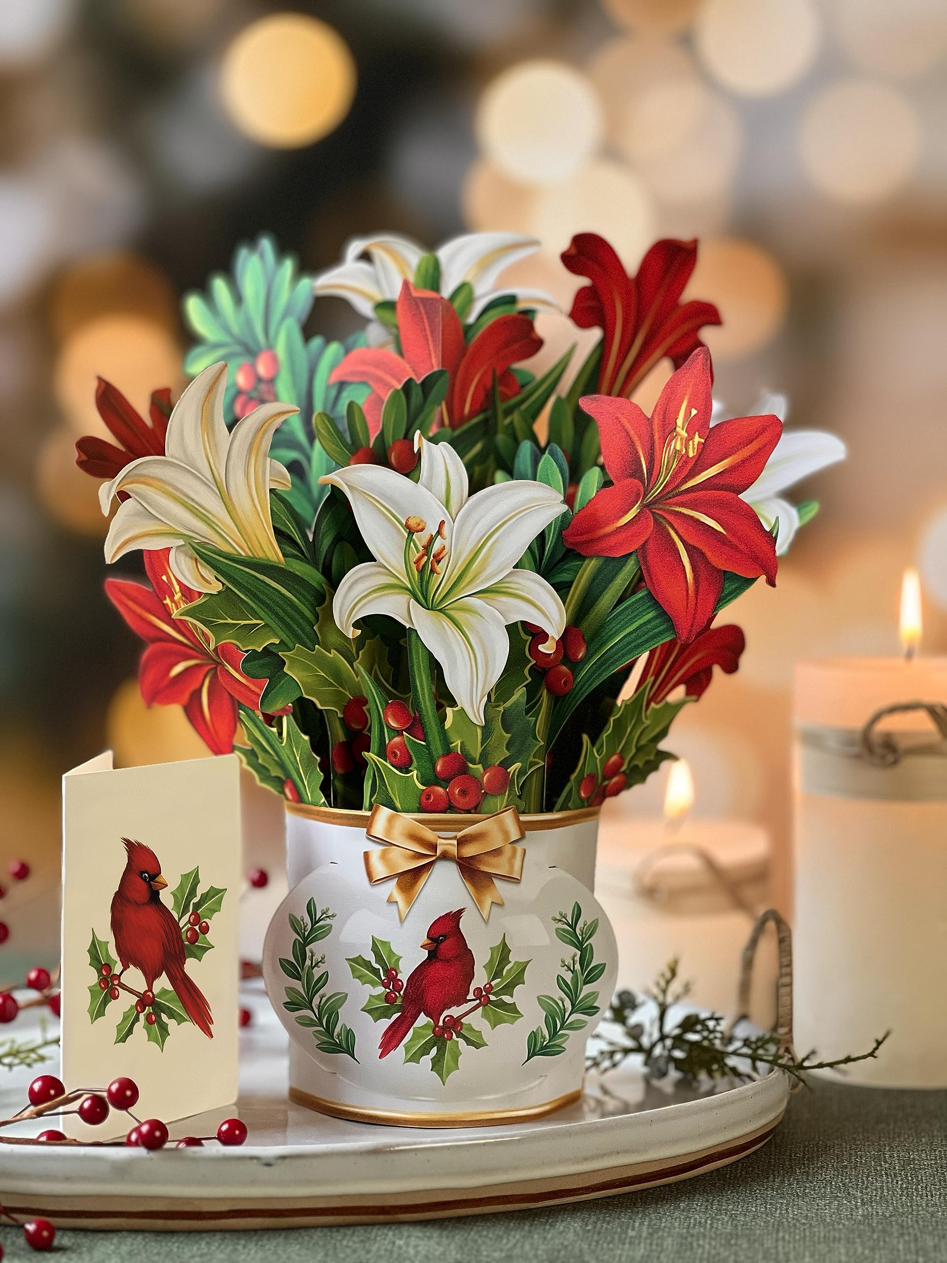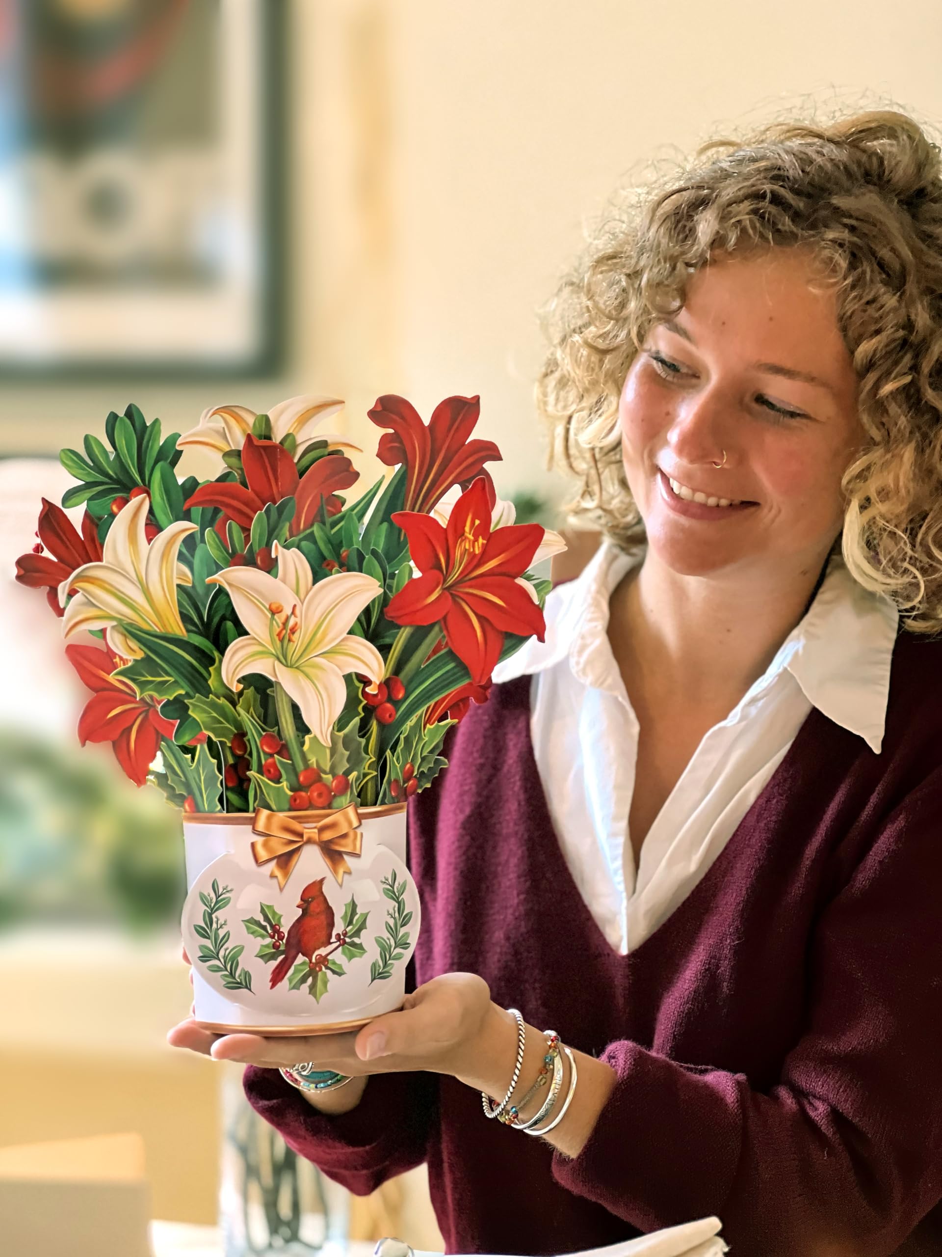 - WINTER JOY BOUQUET unfold in your hand to reveal a joyful artificial flower bouquet in a white pot with a cardinal. Send a warm smile or enjoy unique xmas decorations. A beautiful gift for birthday, holidays, christmas, anniversary, get well or thank you cards.