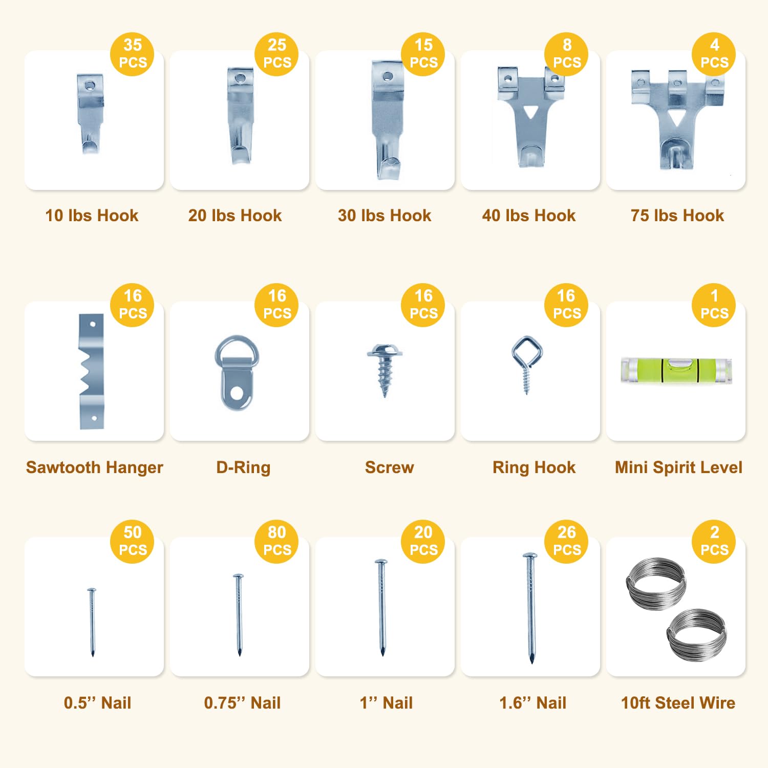 - SATISFIED SERVICE: When you choose us, you're not just getting hardware; you're getting an elegantly organized experience. We are committed to providing every customer premium picture hanging kit and satisfied service. If there are any problems with our picture hanging hooks, contact us, we will give you a satisfactory answer.