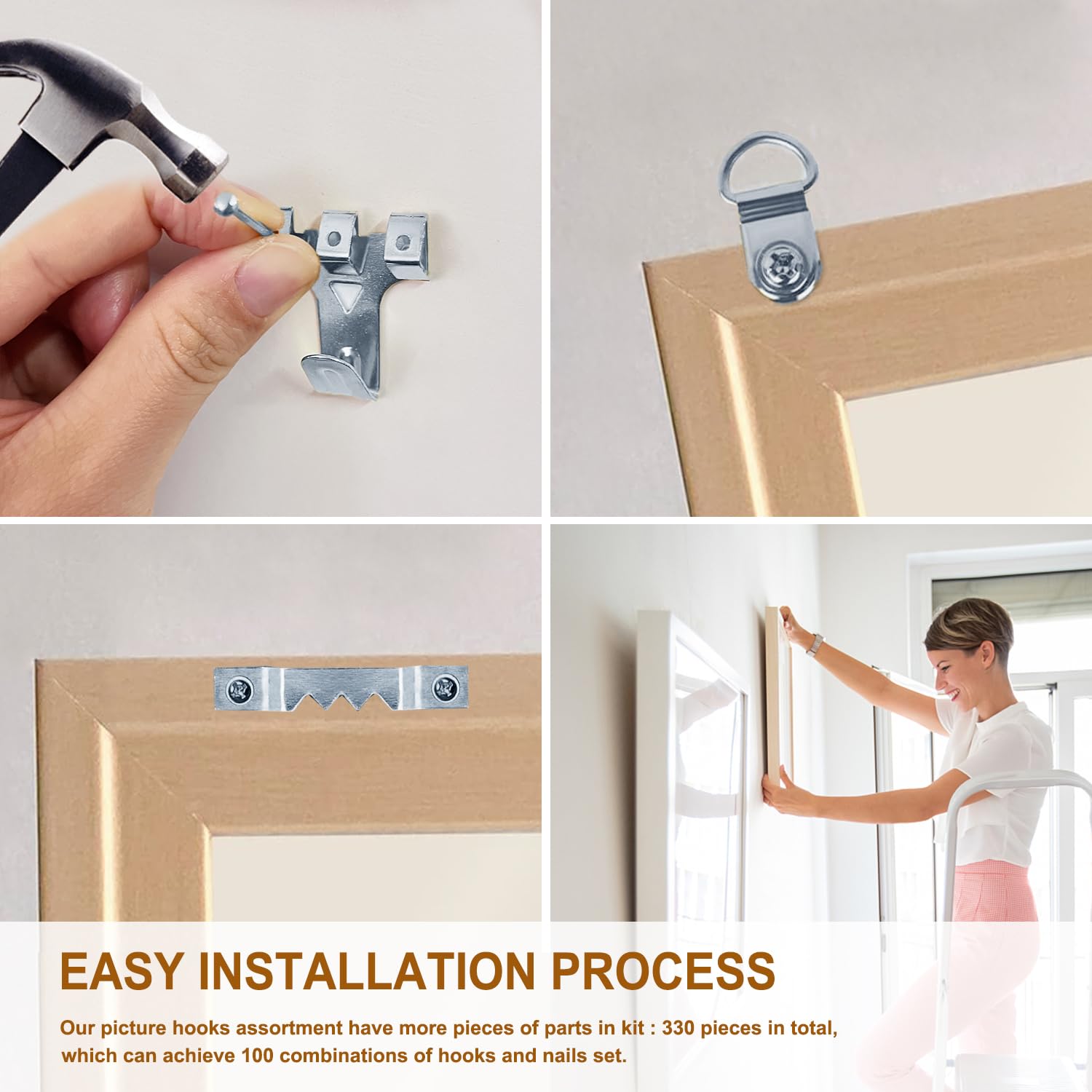- 330pcs PICTURE HANGING KITS: Our picture hooks assortment have more pieces of parts in kit : 330 pieces in total, which can achieve 100 combinations of hooks and nails set. we also have more nails to match the hooks in place of tools you already own.