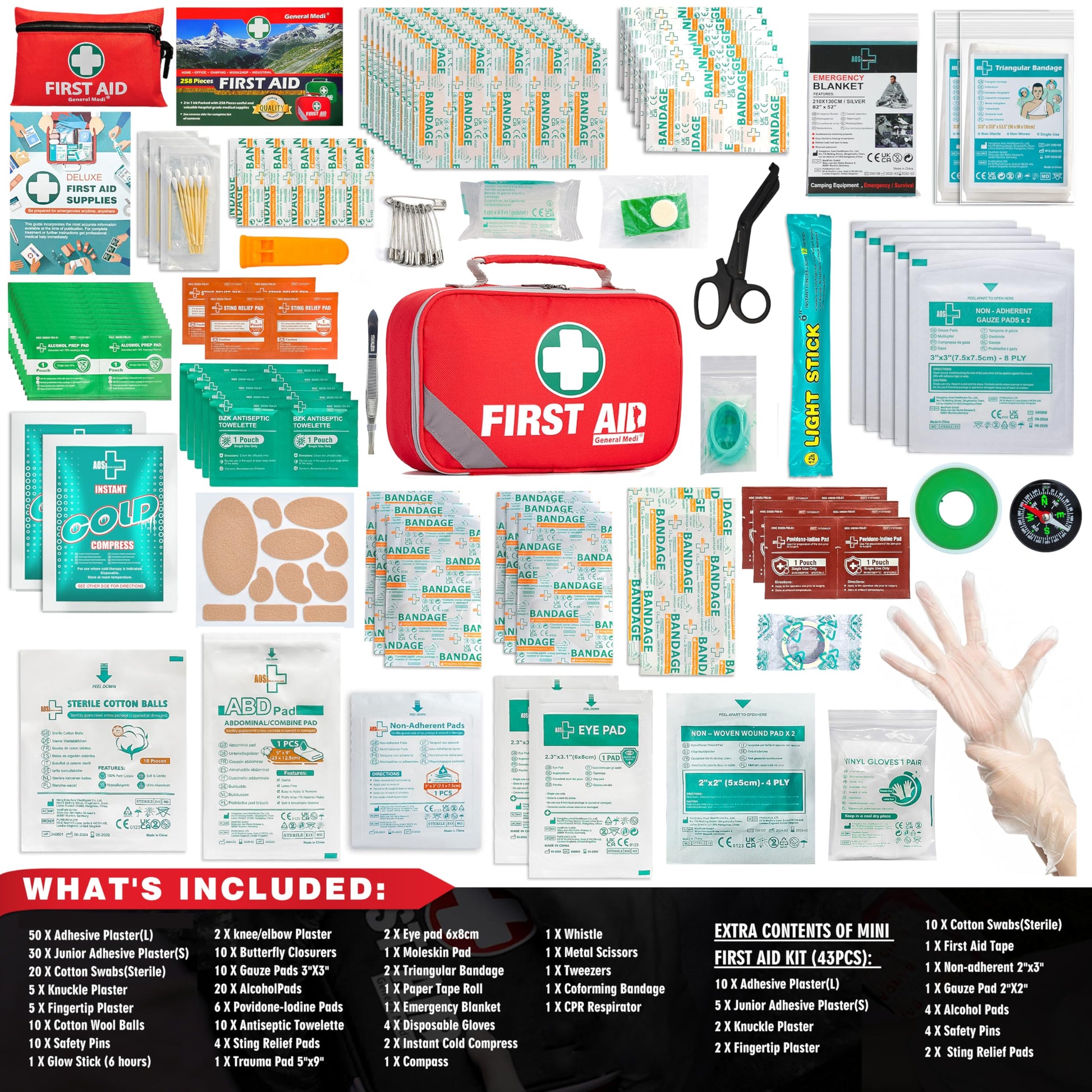 - New design: 2-in-1 Premium First Aid Emergency Kit comes with 215 hospital grade items in a compact, flexible, durable design, weighing only 1.5 pounds and additional 43-Piece Mini 1st Aid Kit.