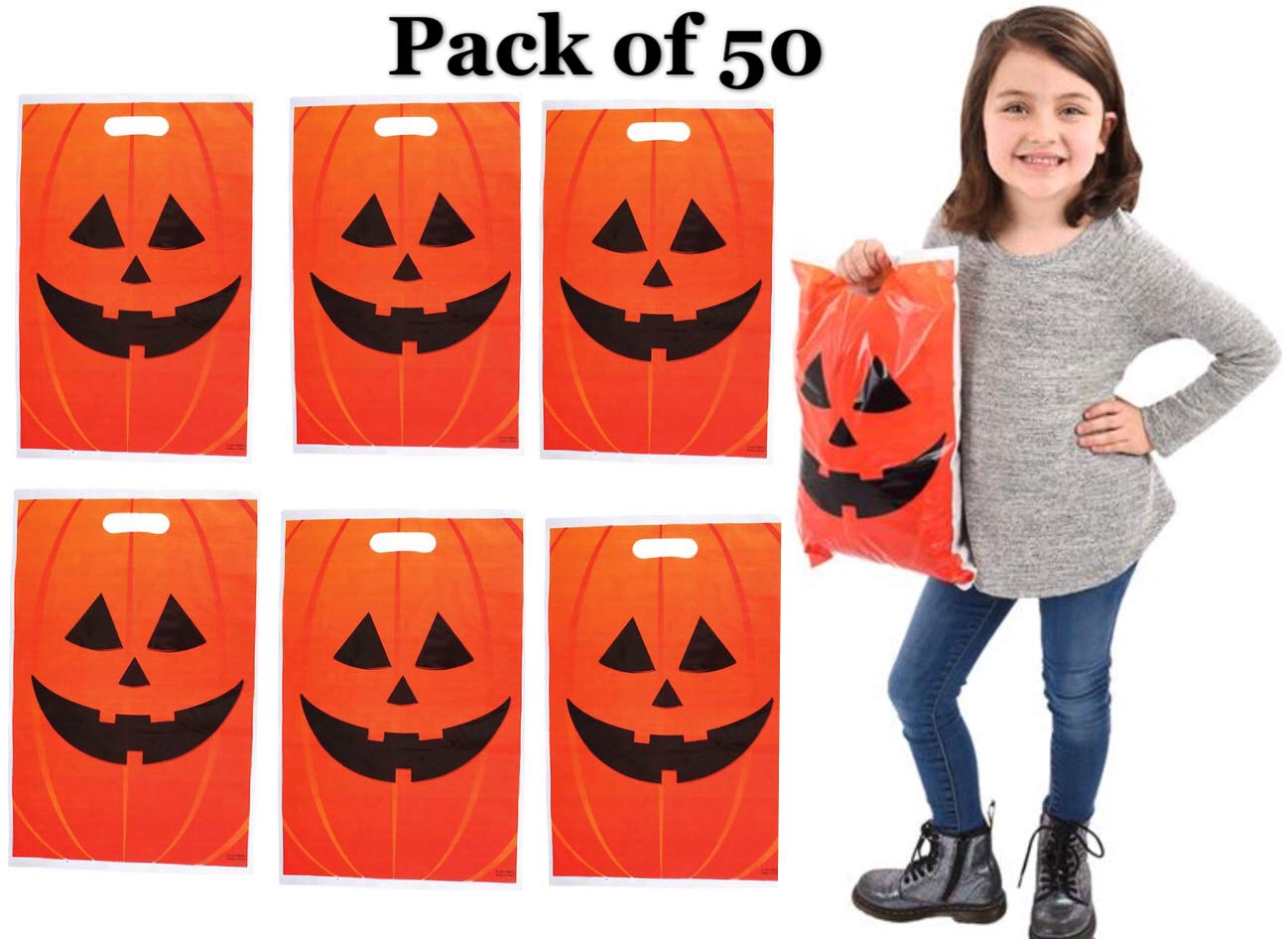 GiftExpress 50‑Pack 11″ × 17″ Jack O Lantern Trick or Treat Goody Bags – Durable Plastic Halloween Party Favor Bags
