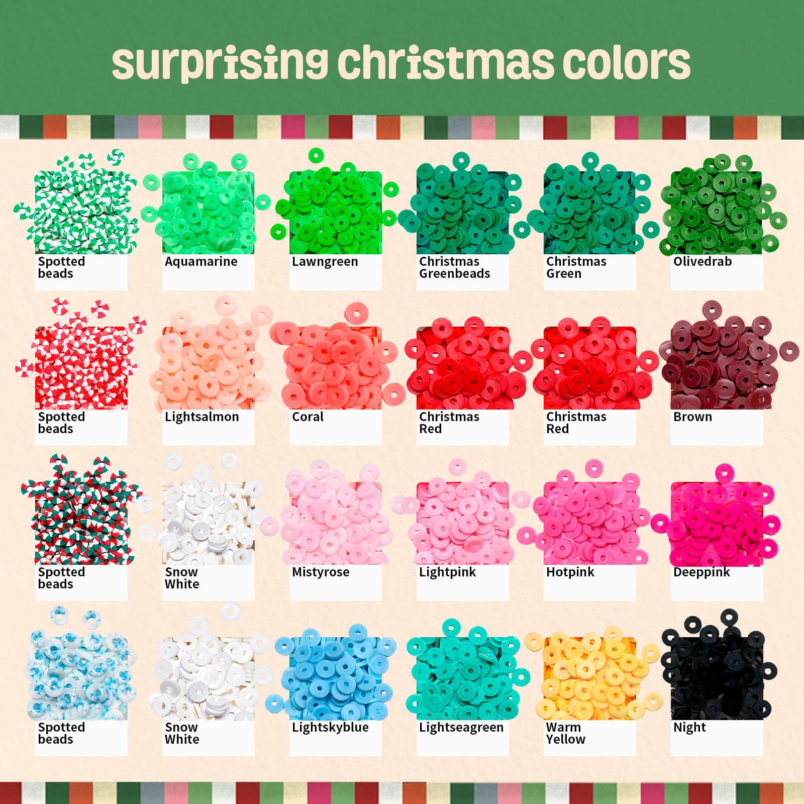 - BRACELET KIT INCLUDED - Flat clay beads in 24 selected colors, includes 4 handcrafted speckled beads, each is about 160pcs. 240pcs gold letter beads. Approx. 120pcs 4mm seed beads in christmas red, green and white. Red crystal diamond-like beads. Christmas-themed, fruits style, flower style polymer clay beads. Smile beads, pearl beads, colorful heart, starfish, and gold spacer beads. Christmas-themed pendants includes Santa, reindeer, xmas tree, stocking stuff, etc