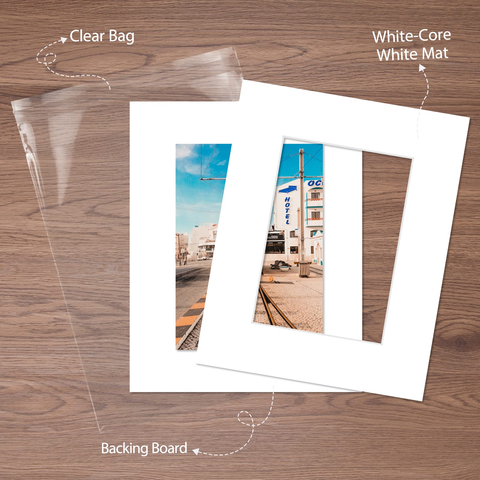 - Set includes: 10 8x10 White Mats, 10 Backing boards, & 10 Clear Bags