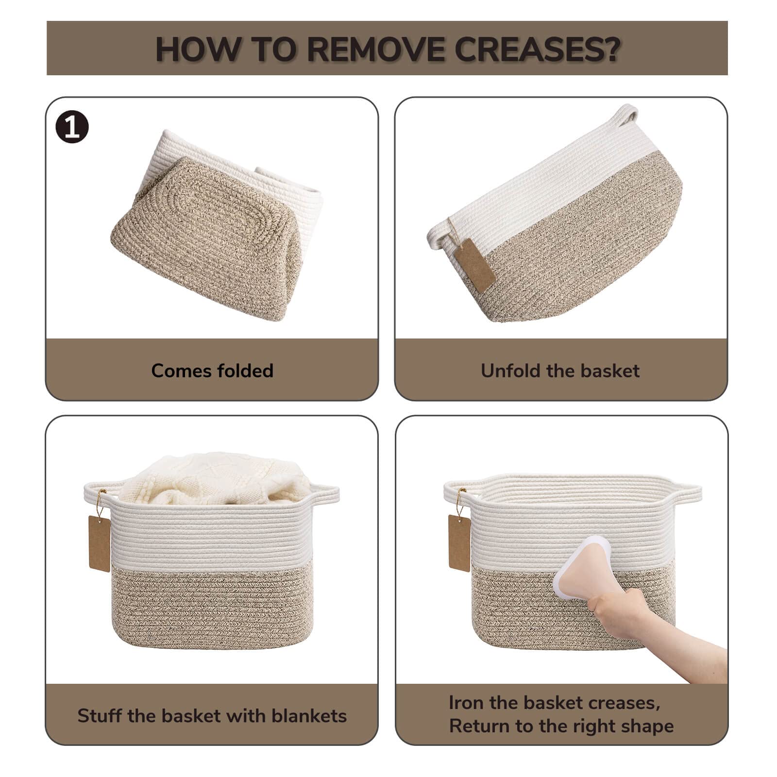 - Note. The storage basket is folded for shipping. It will turn back to its elegant shape quickly by filling it with towels or blankets, and ironing is a great idea to regain the creases. Also, you can fold it into a flat shape for easy storage when not in use