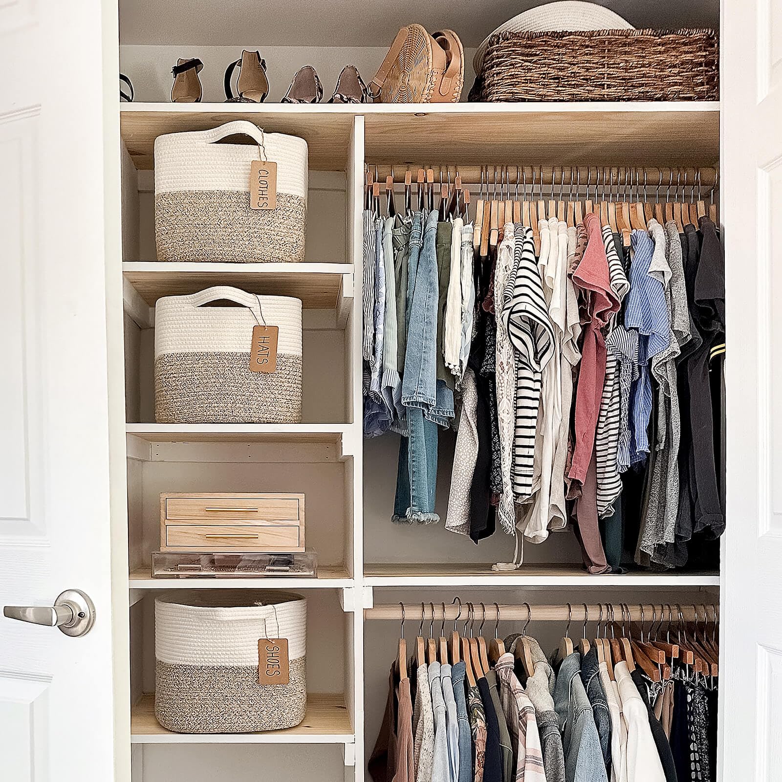 - Small Storage Basket. It comes with labels! When you write words on the label, such as laundry supplies, toys, towels, etc. Even if this storage basket is placed on a high closet shelf, you will immediately know what you are storing