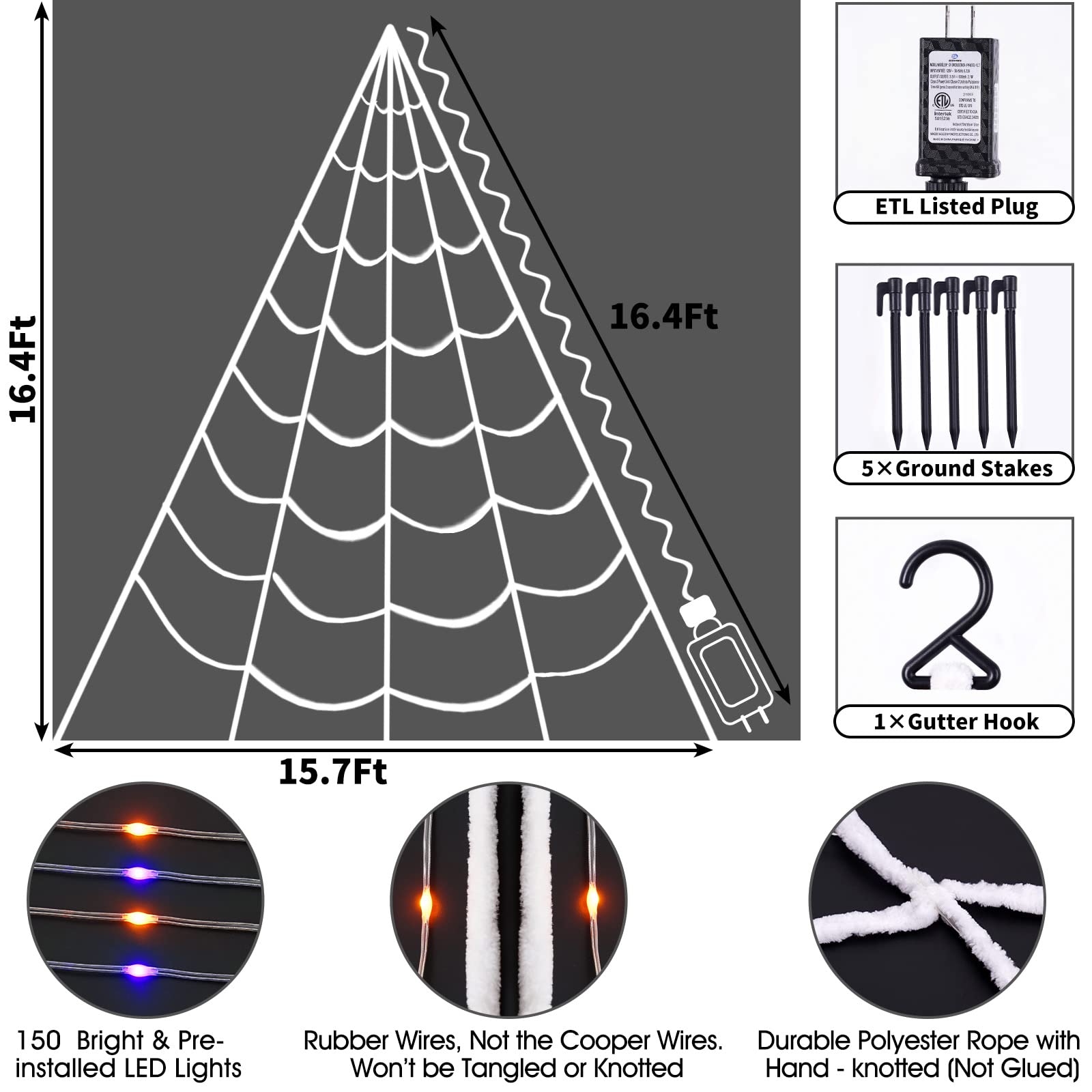 - 【Giant Lighted Spider Web】 Including 16.4 ft x 15.7 ft light-up white web with 150 bright purple & orange LED bulbs, approximately 16.4 ft lead cable which is long enough to plug in the power supply from anywhere. The extra large triangular spider web made of thick polyester rope with hand-knotted (not glued), sturdy enough to withstand the weight of a large spider.