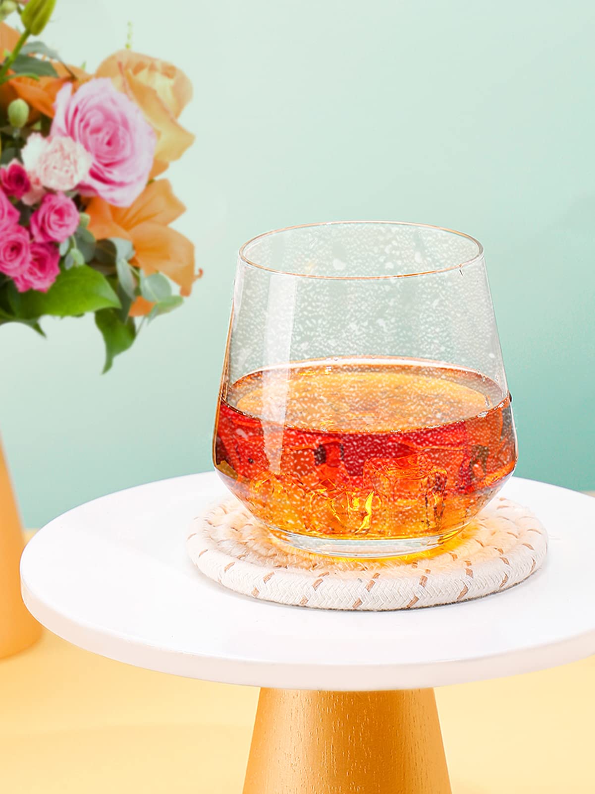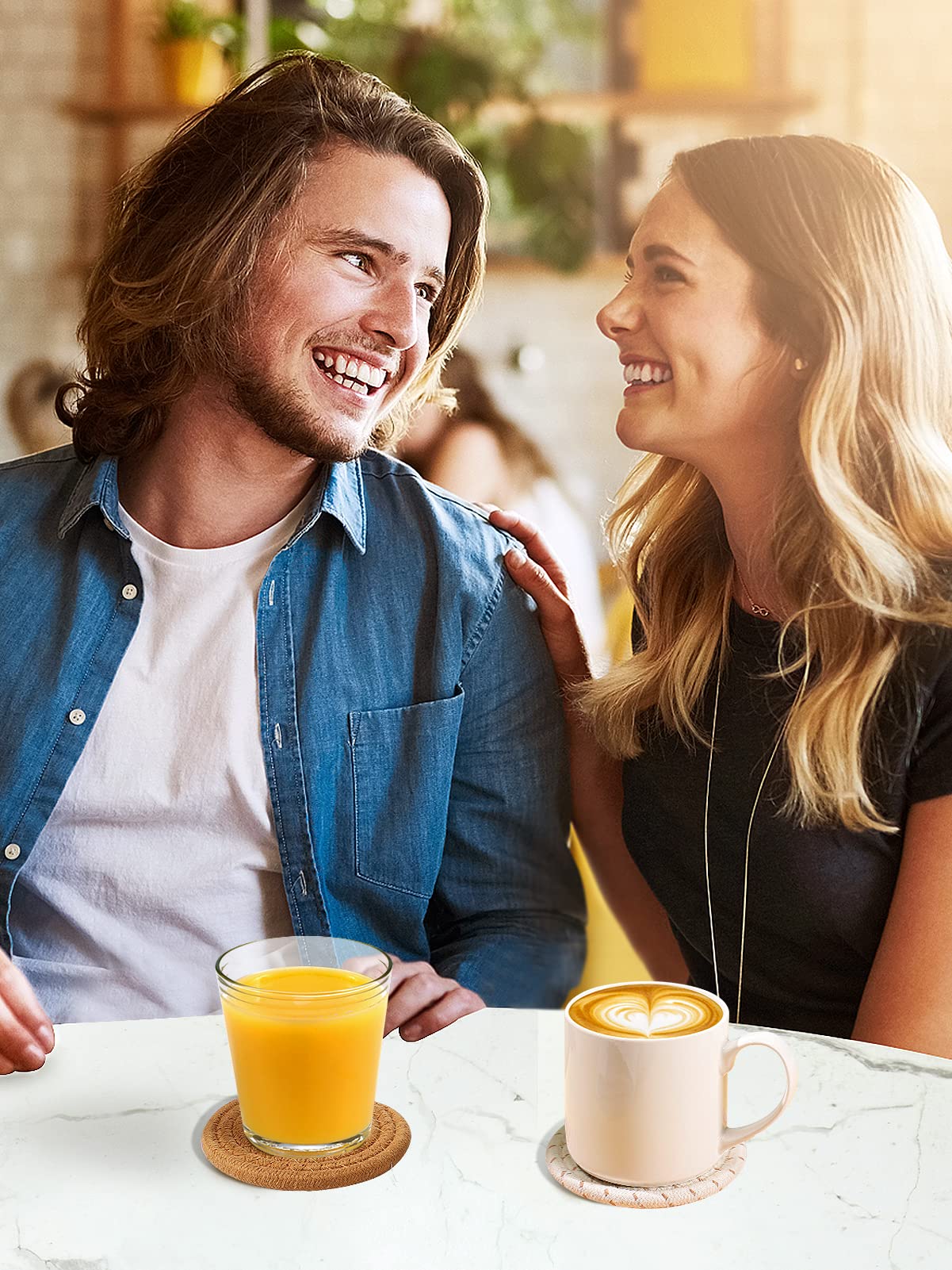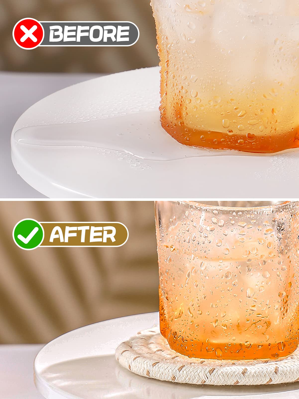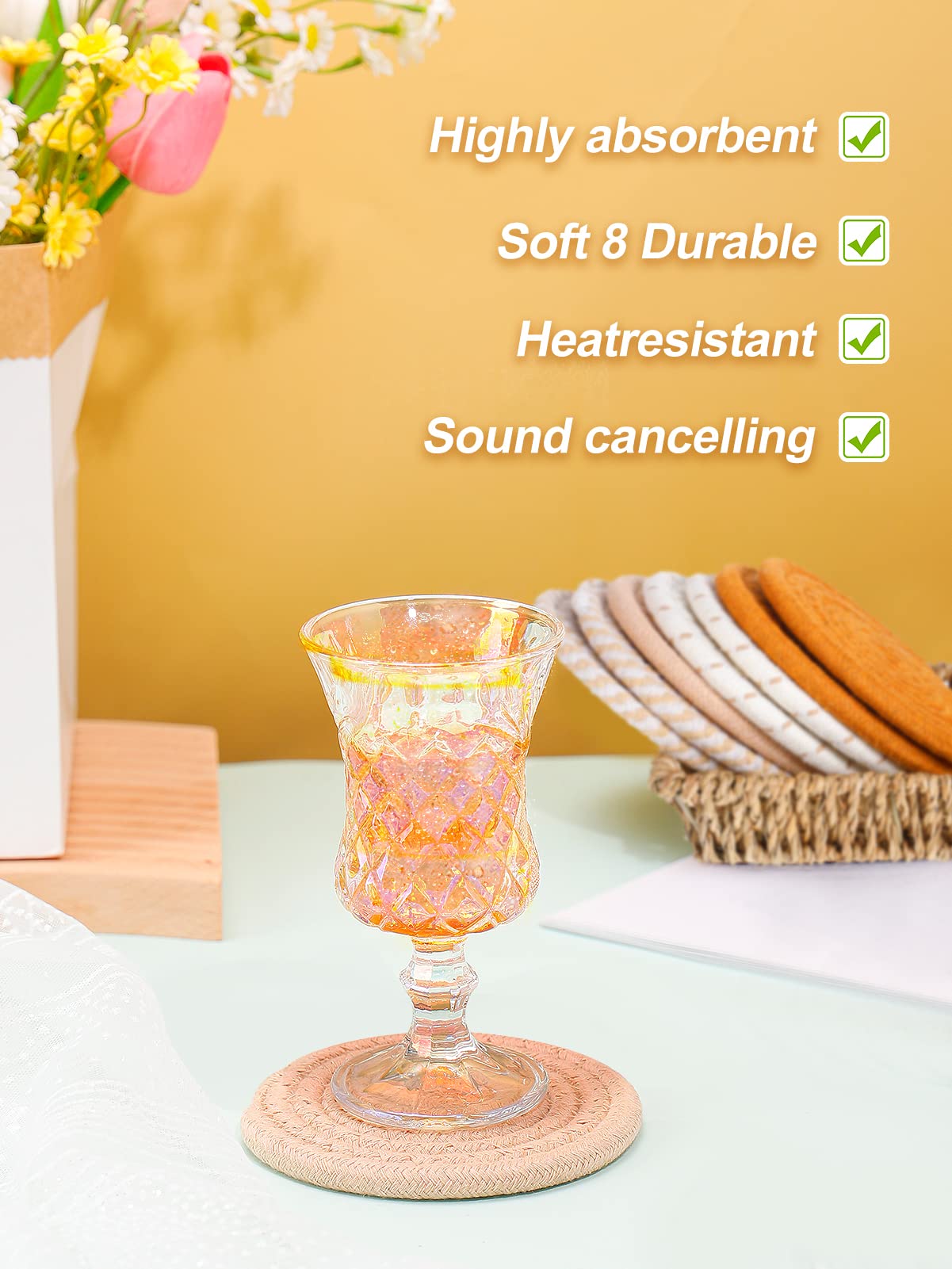 - [Aesthetic & Functional] The absorbent coasters are the perfect addition to your boho or farmhouse accent room, kitchen, bathroom, and office. The woven coasters suit glass cups, coffee cups, wine bottles, beverage cans, etc.