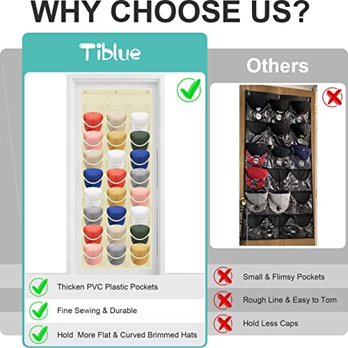 - More Pockets - Holds Up to 27 Caps: Tiblue hat racks for baseball caps over the door storage hat rack for door wall closet comes with 27 visible pockets that easily store and showcase at least 27 hats, 3 more pockets than other hat organizer for baseball caps with 24 pockets on market. Designed with upgraded interface, our baseball cap organizer can effortlessly hold multiple flat & curved brimmed hats in its deep 3.8 inch pockets! Make your home tidy & cleaner, no more clutter with caps hats!