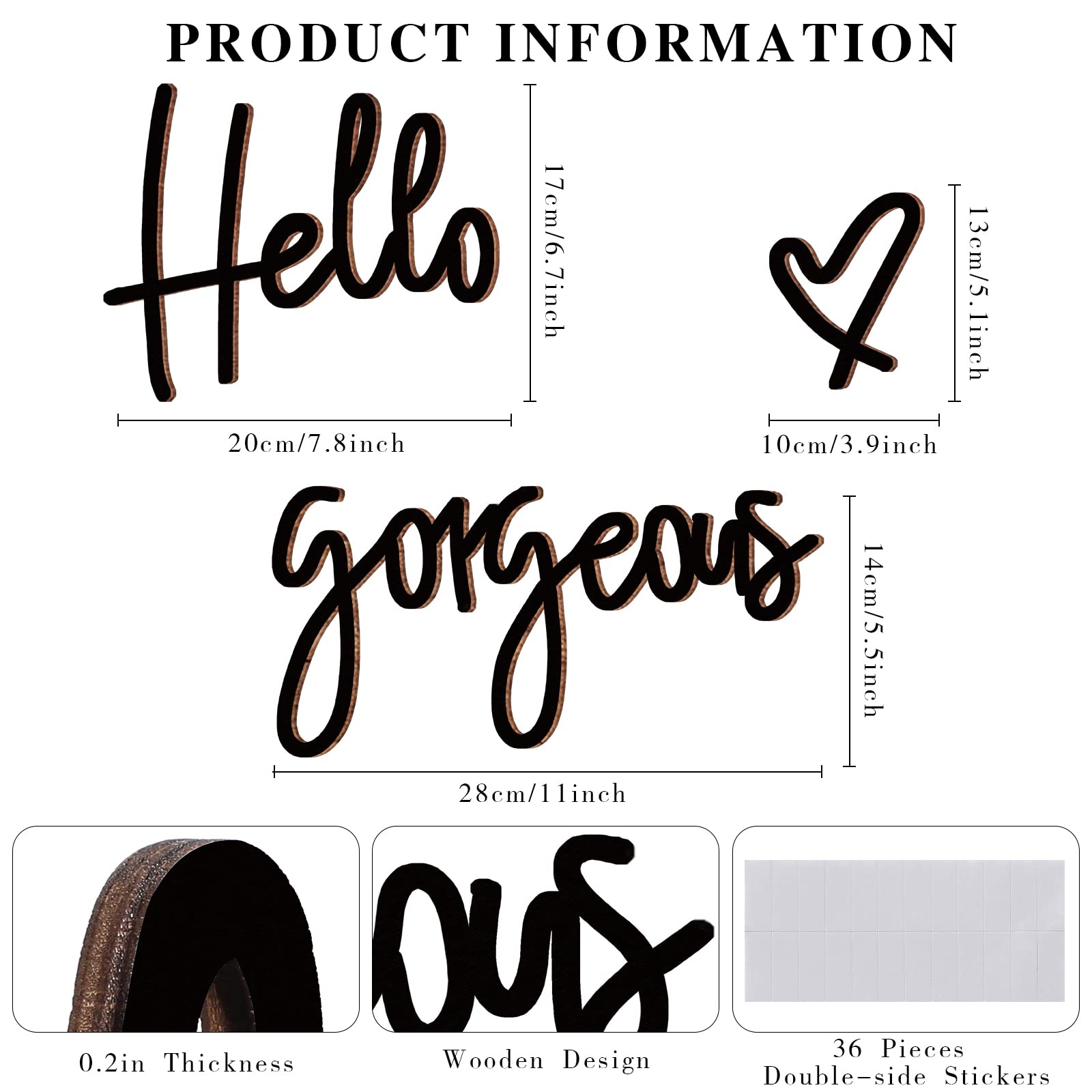 - Size information: the hello gorgeous wall decors contain 3 different letters and patterns, the size of hello is approx. 20 x 16 x 0.5 cm/ 7.87 x 6.3 x 0.2 inch, the size of gorgeous is about 30 x 14 x 0.5 cm/ 11.81 x 5.51 x 0.2 inch, and the love pattern is approx. 10 x 7 x 0.5 cm/ 3.94 x 2.76 x 0.2 inch