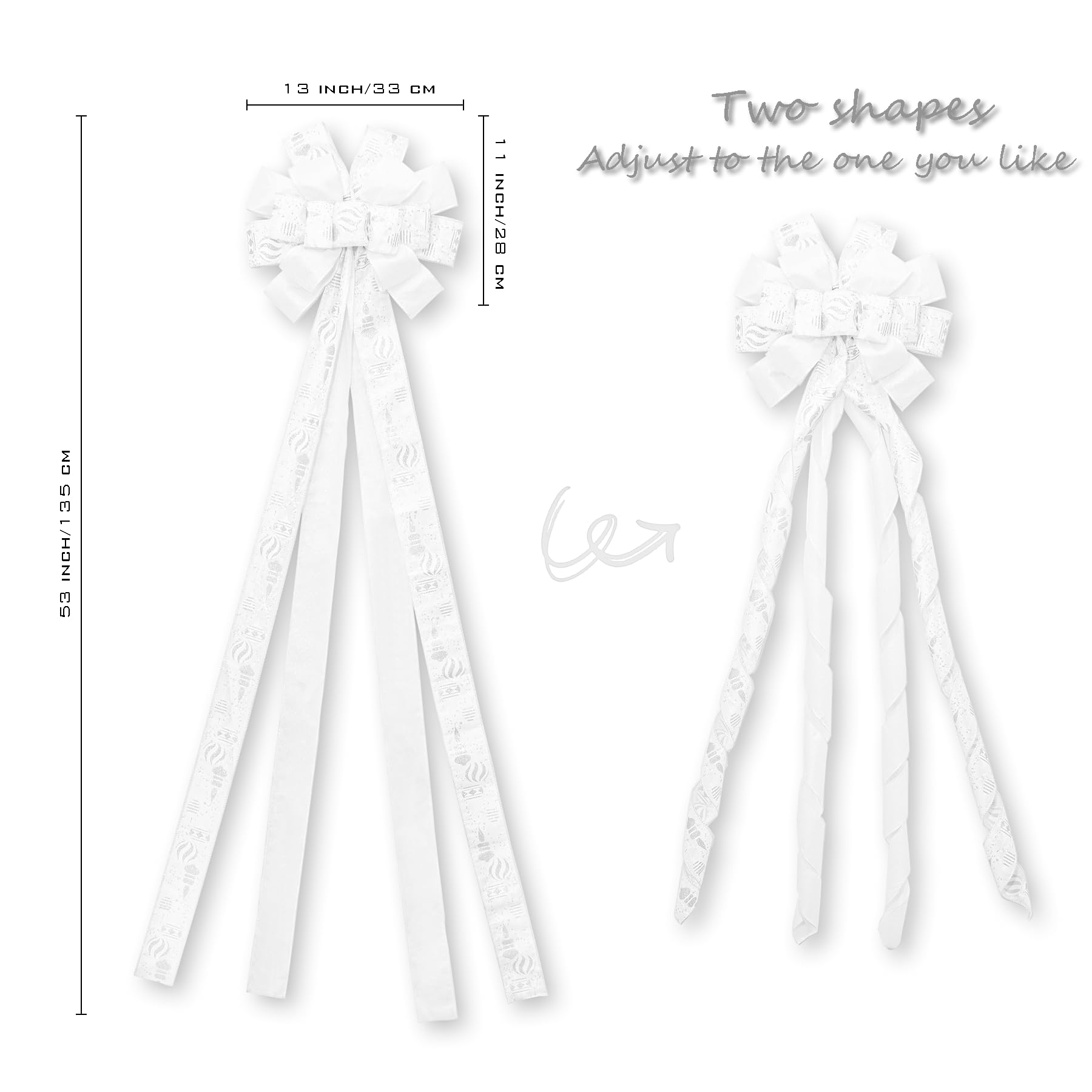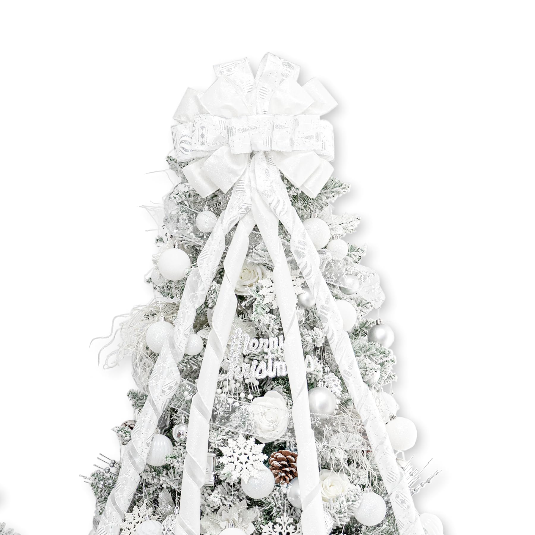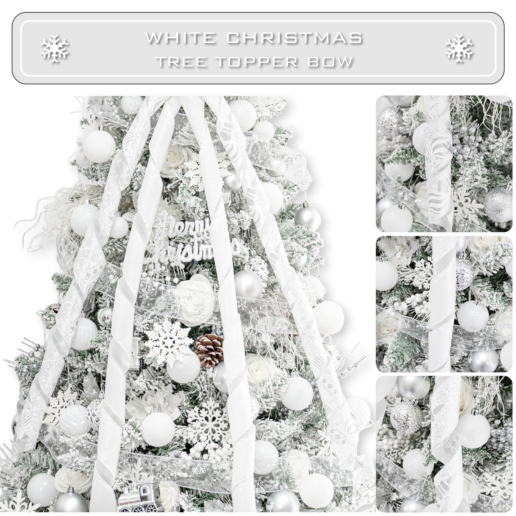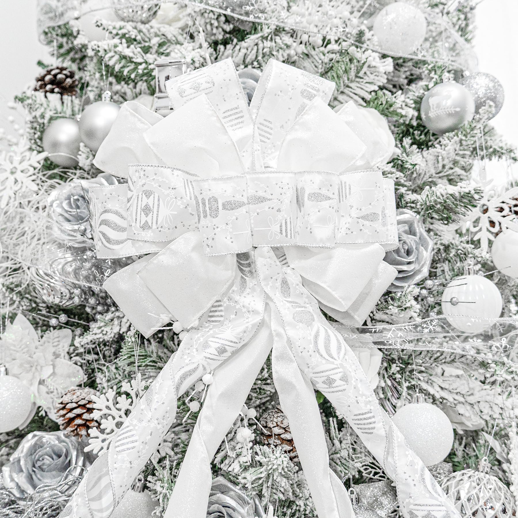Hismir Christmas Tree Topper Bow,53x13 Inches Large Christmas Bow with Glitter Streamer and Patterned Ribbon,Decorative Bows for Xmas Tree Wreath Door Festival Home Decor(White)