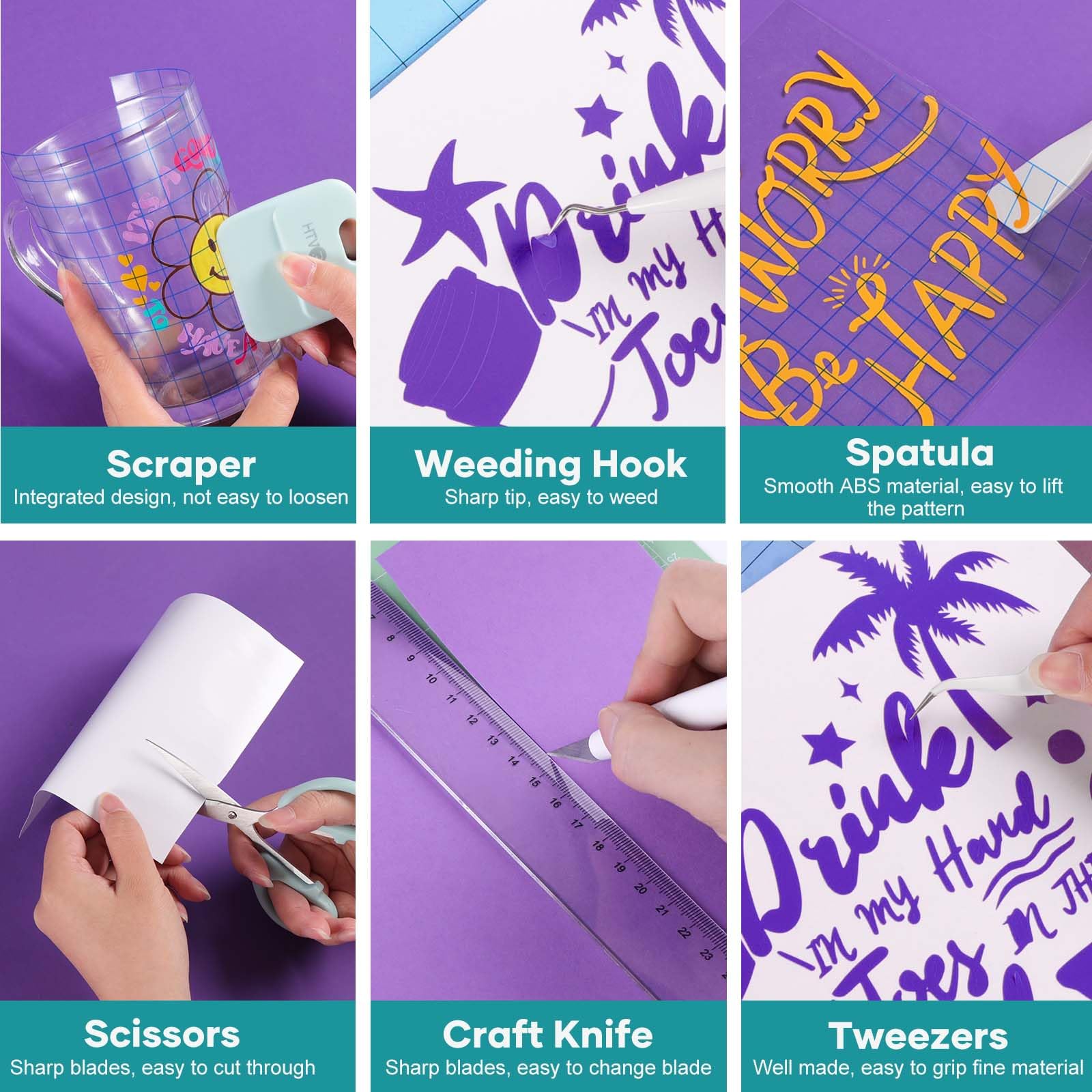 - ✂【6 PCS VINYL WEEDING TOOL KIT】HTVRONT weeding tools for vinyl includes a scraper, tweezers, craft knife, weeder, saptula, and scissors. This is a 6 in 1 package that helps to personalize and customize the design. It is a must-have tool for your handmade crafts for Cricut cutter and you spend the least money on the best crafting tools.