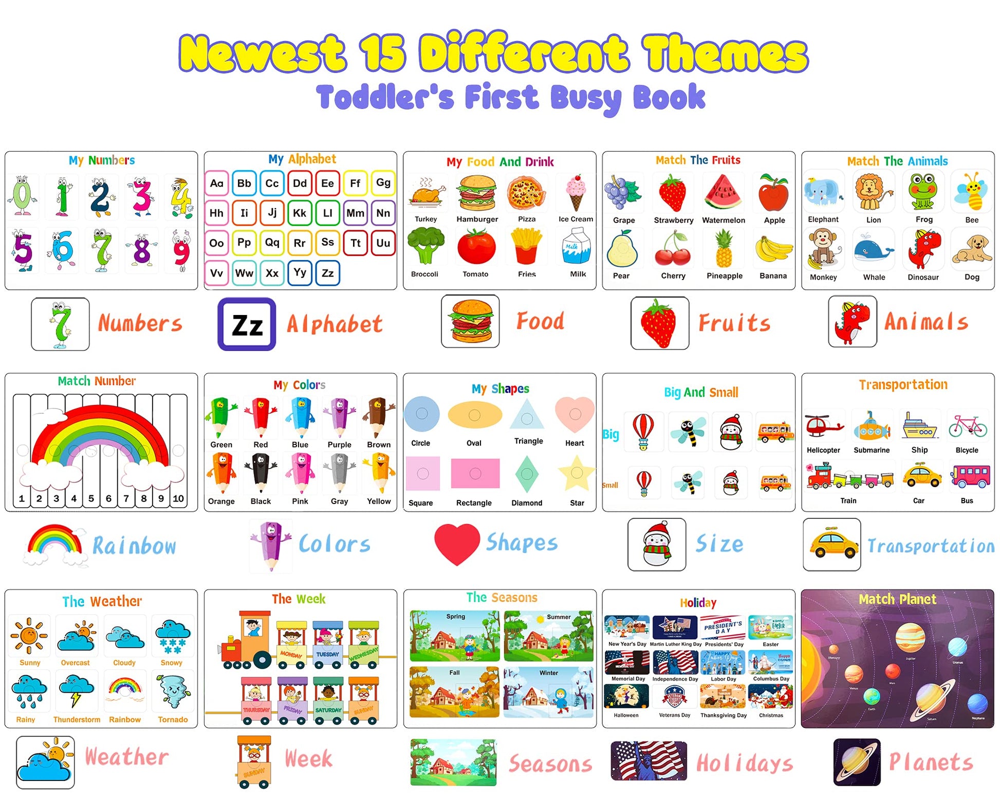 - ⭐【15 THEMES AND 14 DRAWING&WRITING PAGES】 This Busy Book covers 15 themes, including numbers, alphabet, Food & drink, fruits, animals, rainbow, colors, shapes, size discrimination, transportation, weather, week, seasons, holidays and planets. Each themes can enrich the child's knowledge base. There is also a 14-page drawing and writing page to meet the needs of children who love to write and paint, and is equipped with 8 colored pens..