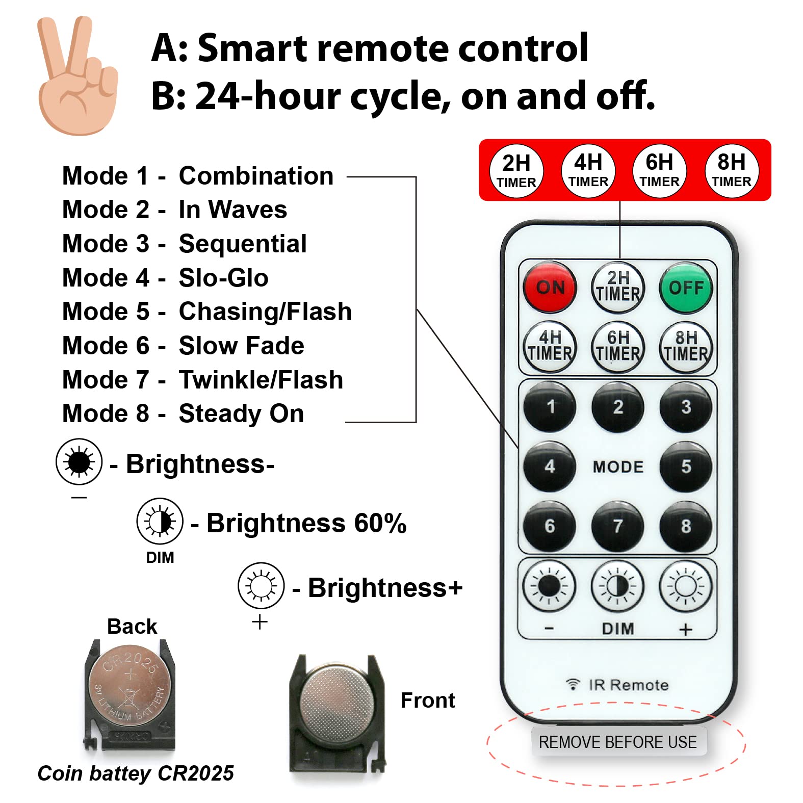 - 8 Modes and Timer: Unlike others, our 17-Keys remote added 4 timing modes (2/4/6/8 hours on, 22/20/18/16 hours off); 8 different flash modes to choose from, and you can adjust the brightness by pressing "dim" ,“+” and "-"; That are all controlled easily with a wireless remote from a distance of 10 to 15 meters, aim at the USB receiving direction when you press; All is in your control