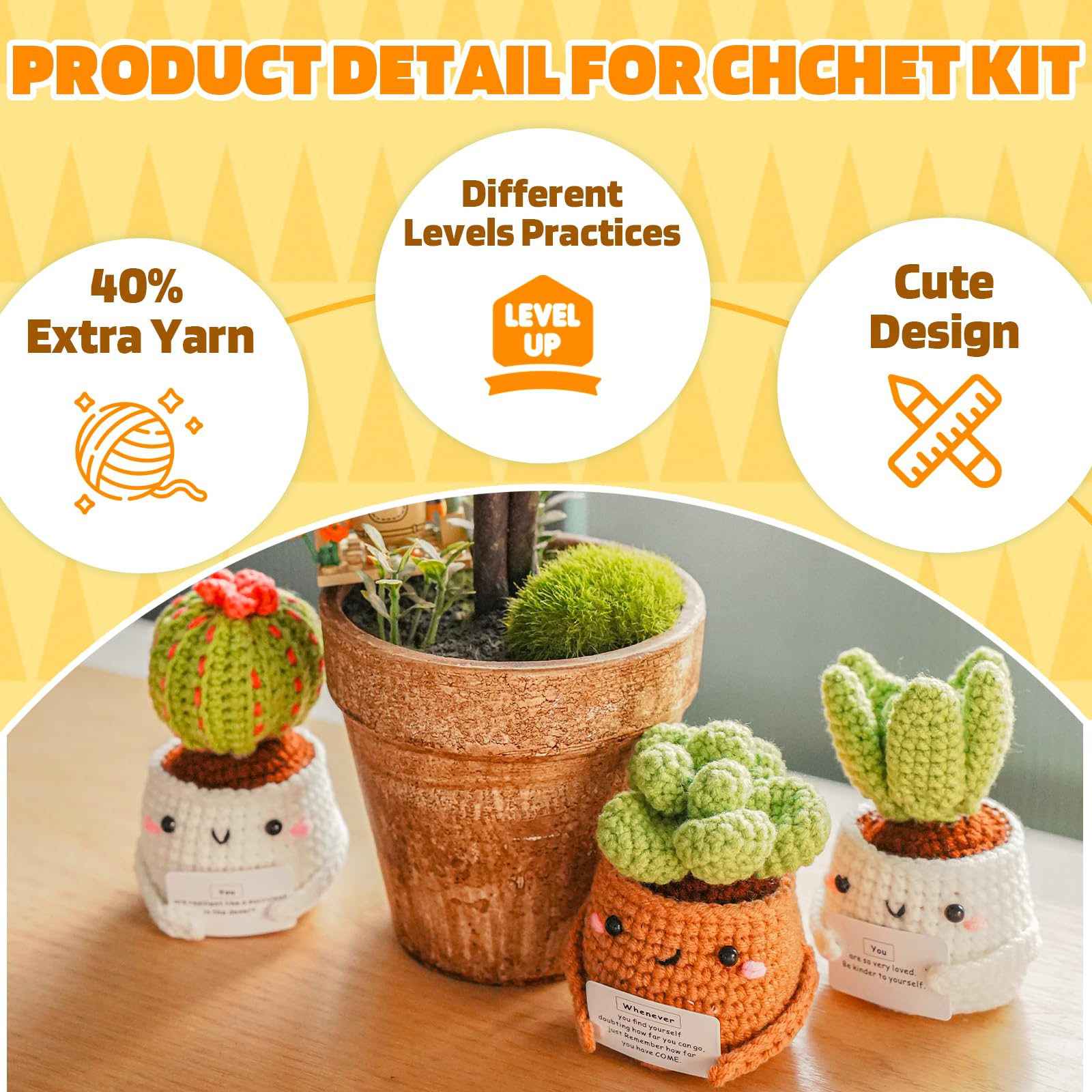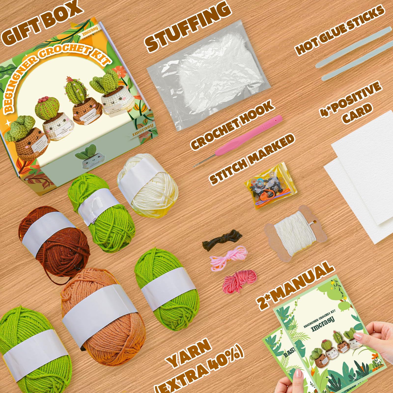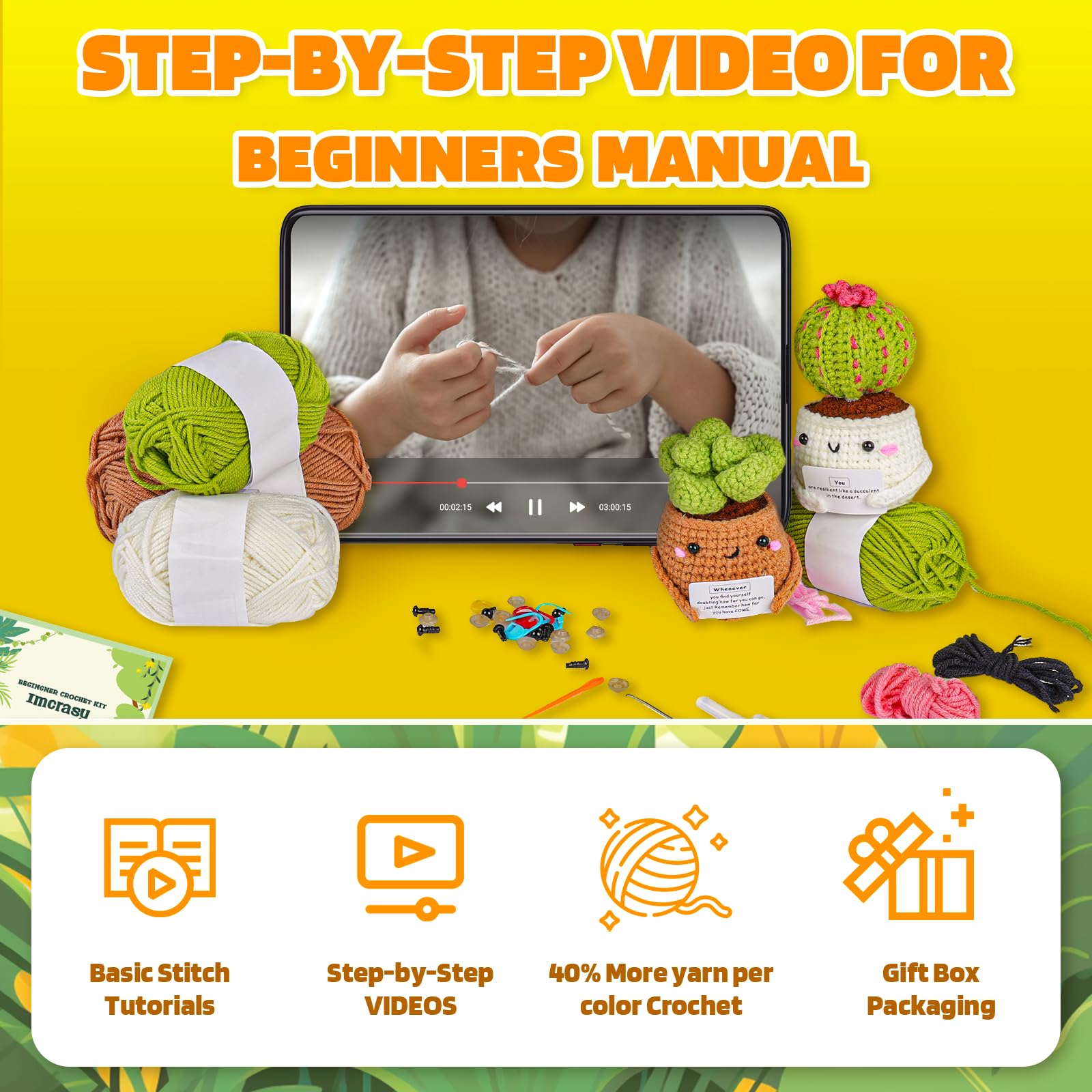 Imcrasy Beginner Emotional Support Succulent Crochet Kit with Step by Step Video Lessons | 4 PC Succulent Crochet Kit with Accessories (40%+ Yarn)