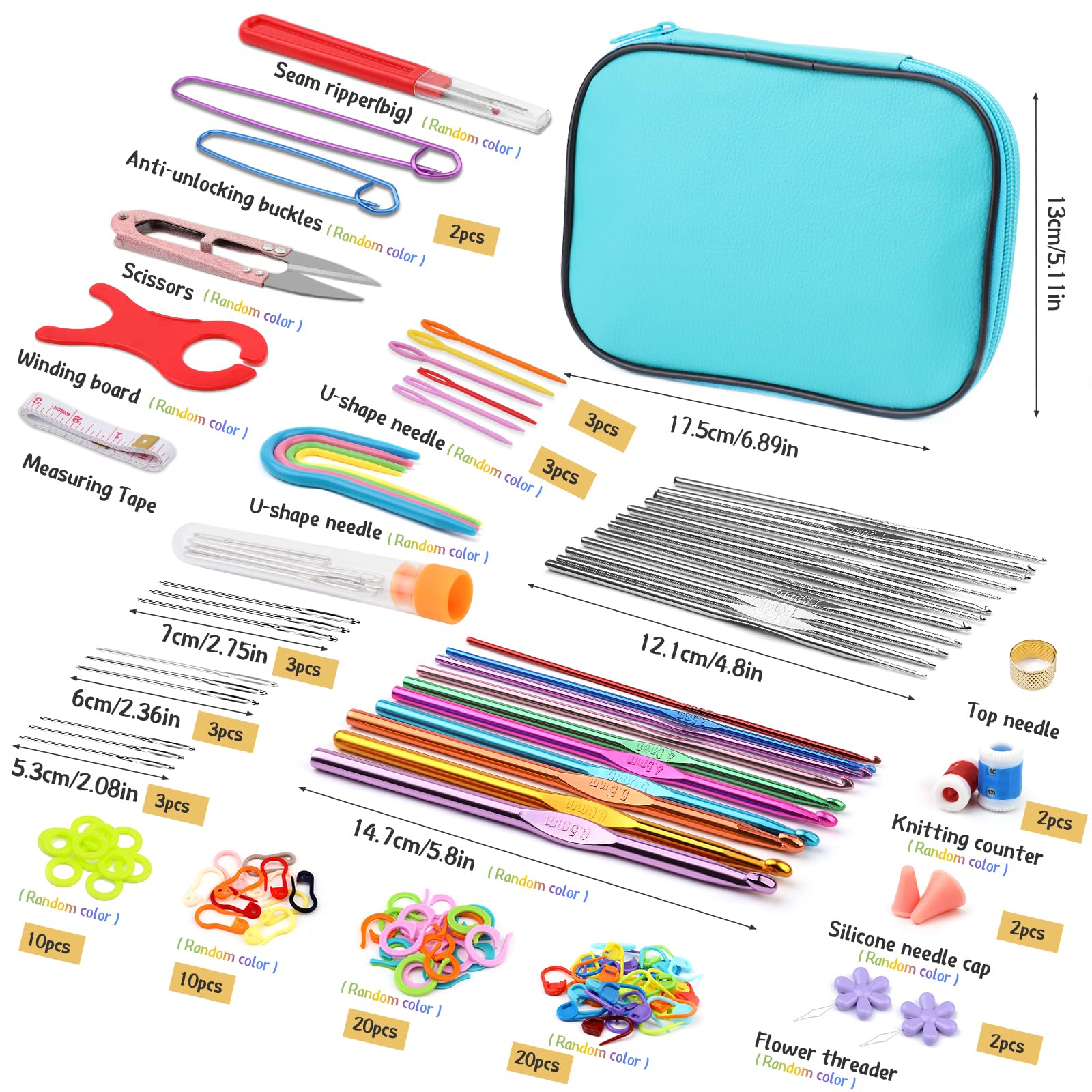 - Great Value Crochet Set: 22 pcs crochet hooks set, 20 pcs knitting stitch markers, 9 pcs blunt big eye needle, 6 plastic large eye needle, 20 pcs round knitting markers, 20 pcs bulb pins, 1 pcs scissors, 1 pcs needle bottle and other crochet accessories which really perfect for beginners