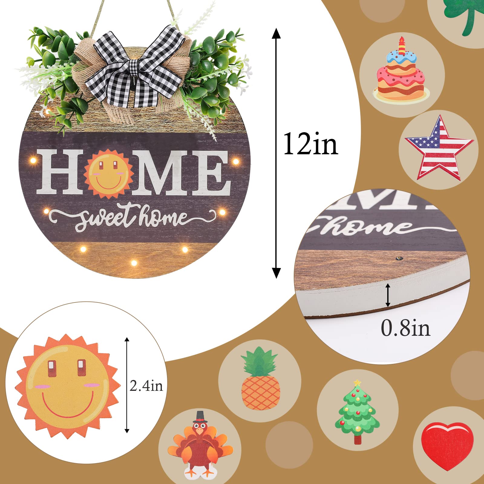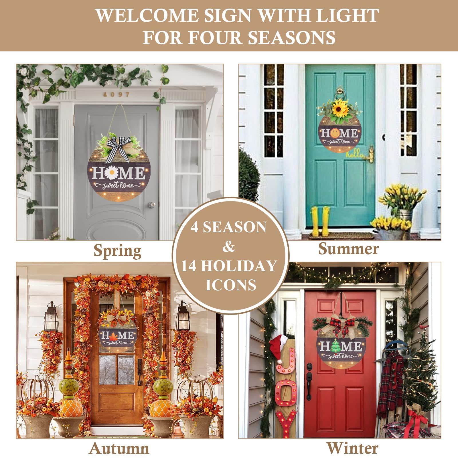 - INTERCHANGEABLE SEASONAL WELCOME SIGN - The wooden seasonal wreath for front door is about 12 x 12 x 0.8 inches, features 4 styles of season with spring wreath、summer wreath、fall wreath、winter wreath and 12 LED light, 14 styles of holiday pendants with rabbit, star flag, love, clover, chicken, maple leaf, cake, home, football, pineapple, pumpkin, sun, sunflower and Christmas tree, you can change each wreath and Changeable Icon to your needs to welcome each season with a different feeling.