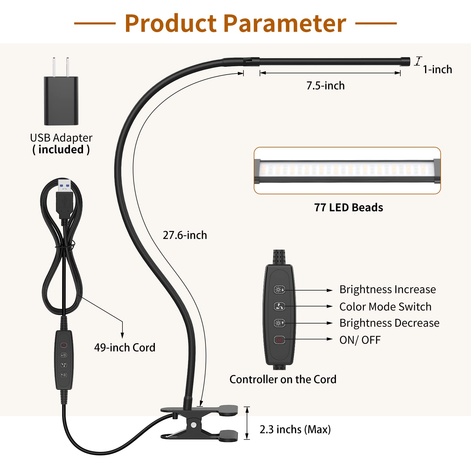 - 【WHAT YOU'LL GET】: 1x Desk Lamp with Clamp, 1x USB Power Adapter (5V/2A), 1x User Manual, 1x 24-months-warranty.
