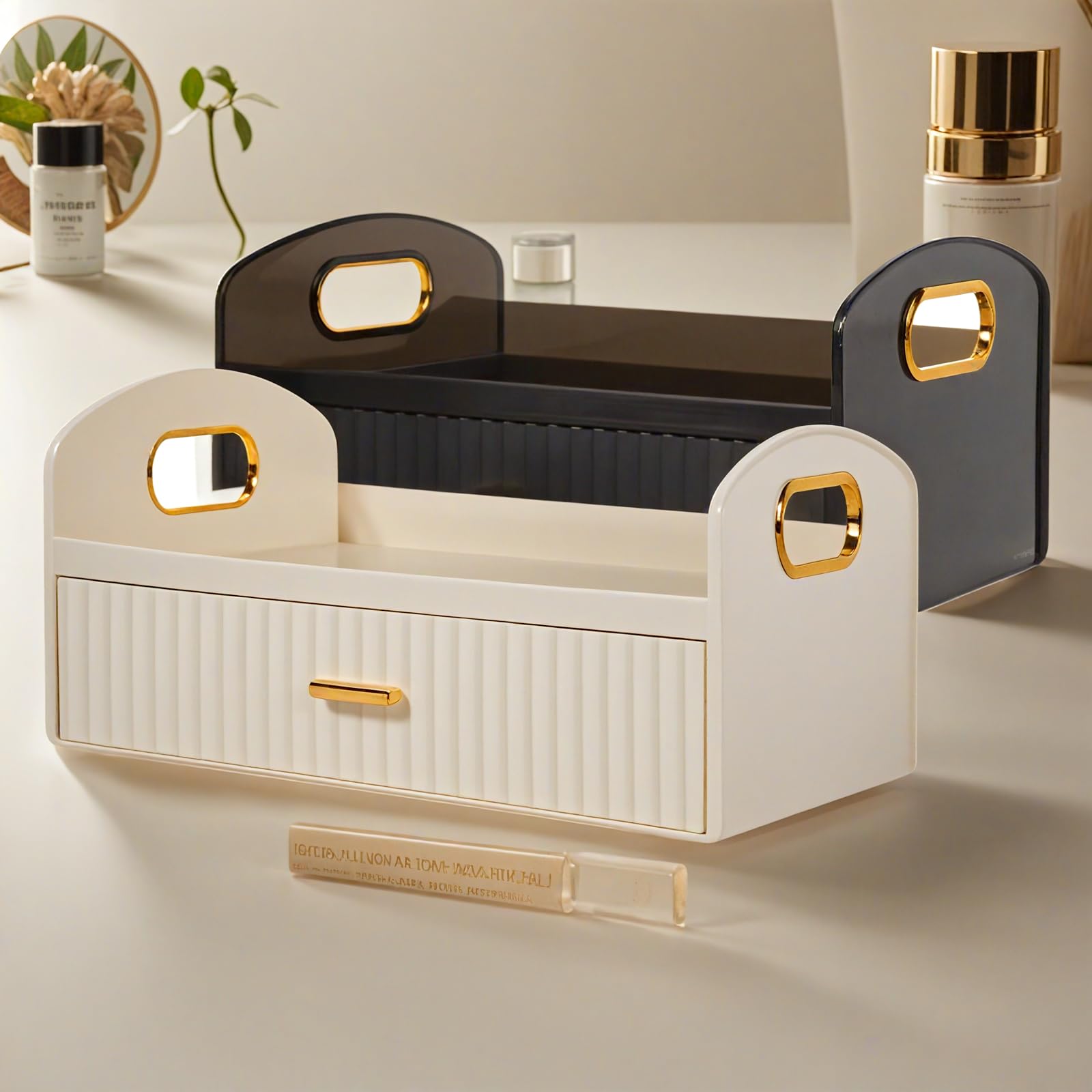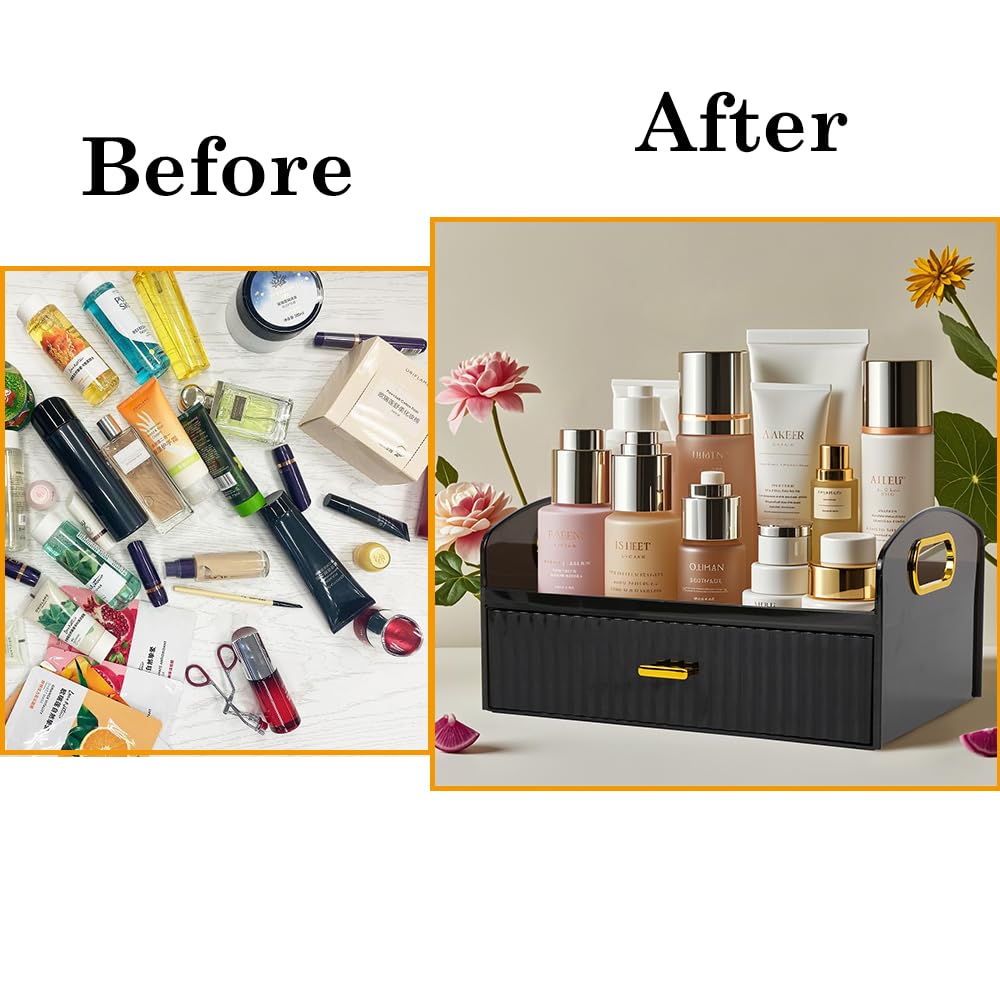 - LARGE SPACE: The skincare organizer is made of a combination of drawers and a top organizer table, which can easily accommodate lipsticks, essences, lotions, sunscreen, makeup brushes, face masks and more