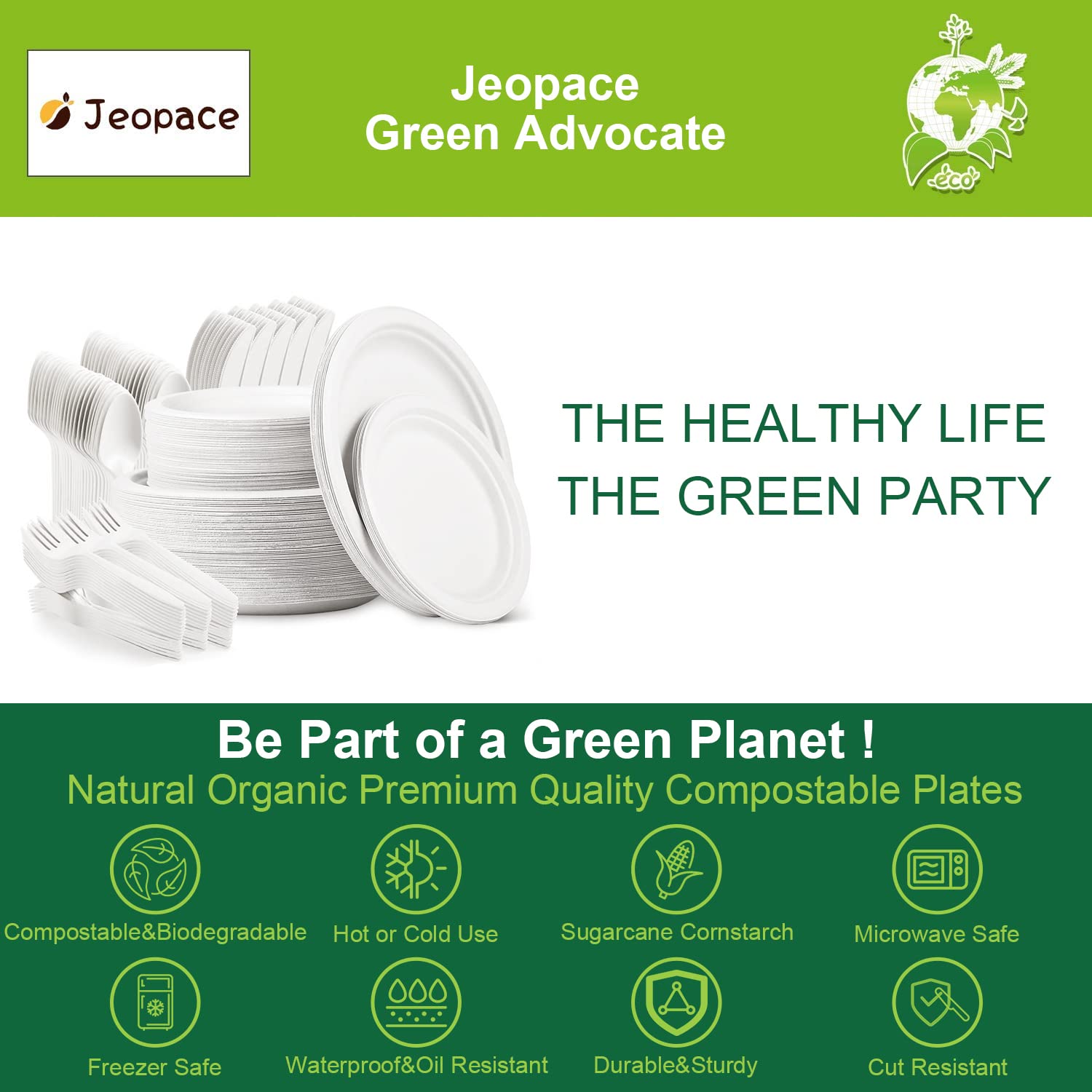 - Paper Plates Set 250 PCS:Includes 50 sugarcane bagasse paper plates 9 inches,50 sugarcane bagasse paper plates 7 inches,50 cornstarch forks,50 cornstarch knives and 50 cornstarch spoons.Jeopace eco friendly paper plates set is suitable for 50 people.
