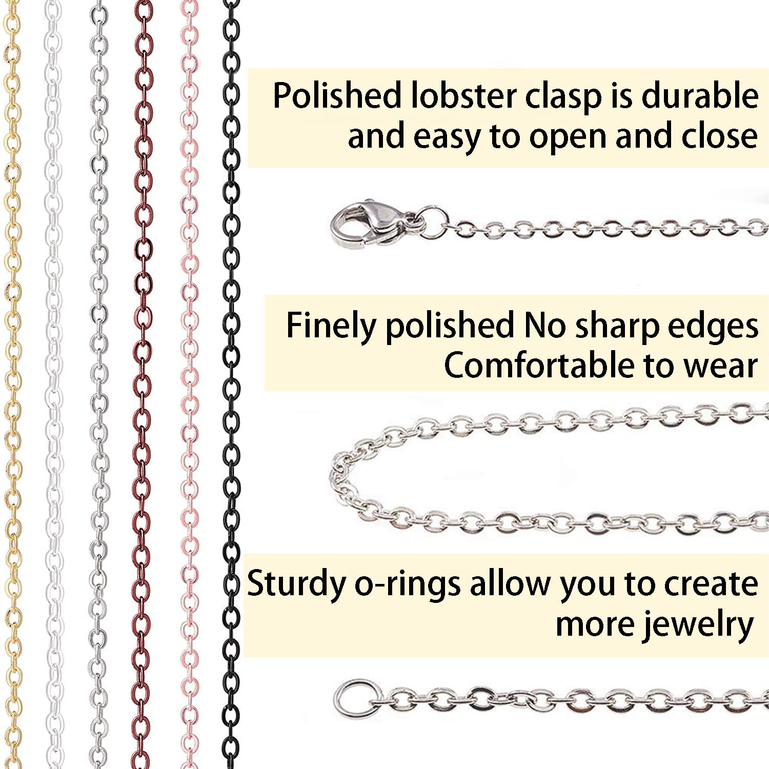 - THIN & STRONG: The size of the chain links are 2.5mm long, 2mm wide, 0.5mm thick; the lobster clasps are 10mm long, 5mm wide; the jump rings are 4mm long, 4mm wide - Small, fine, but strong and sturdy. Great for jewelry making findings supplies.