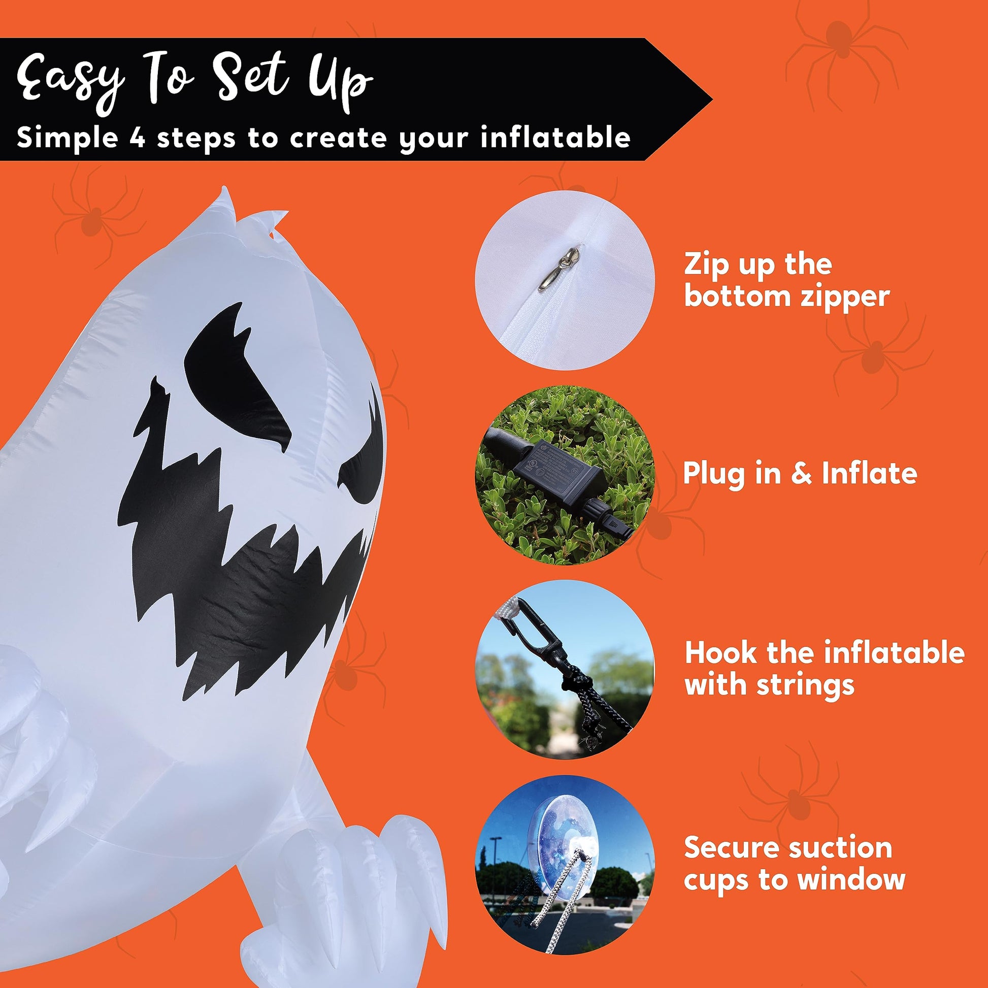 - Ease of Use. Setting up and operating this Halloween inflatable is hassle-free. Simply plug it in, and watch as it quickly inflates to its full 4.5ft size. Includes suction cups and tethers for stability, ensuring that the scary ghost remains securely in place during your Halloween festivities.
