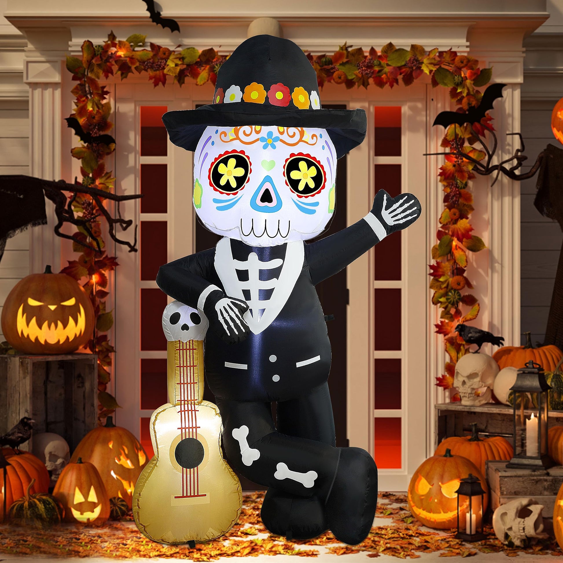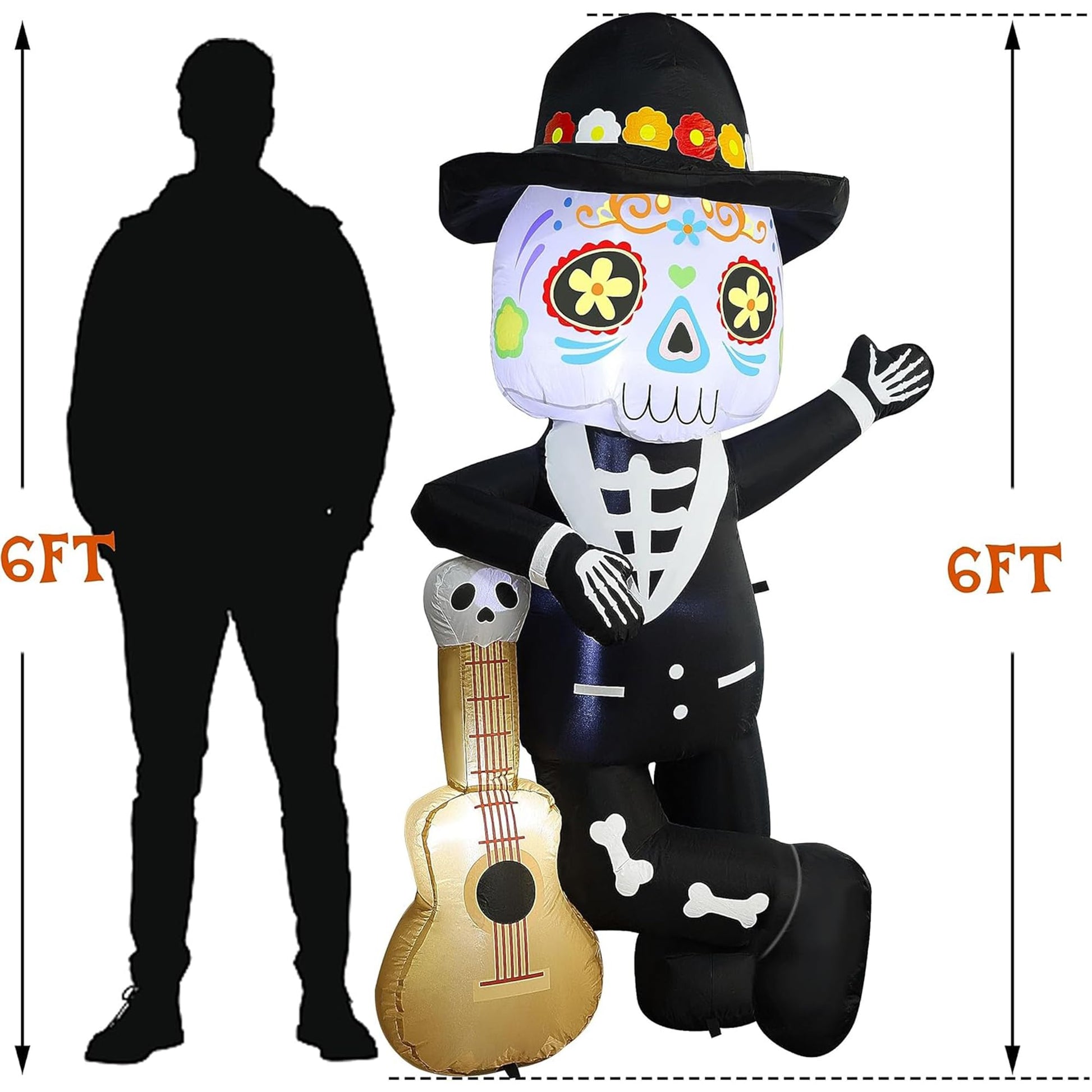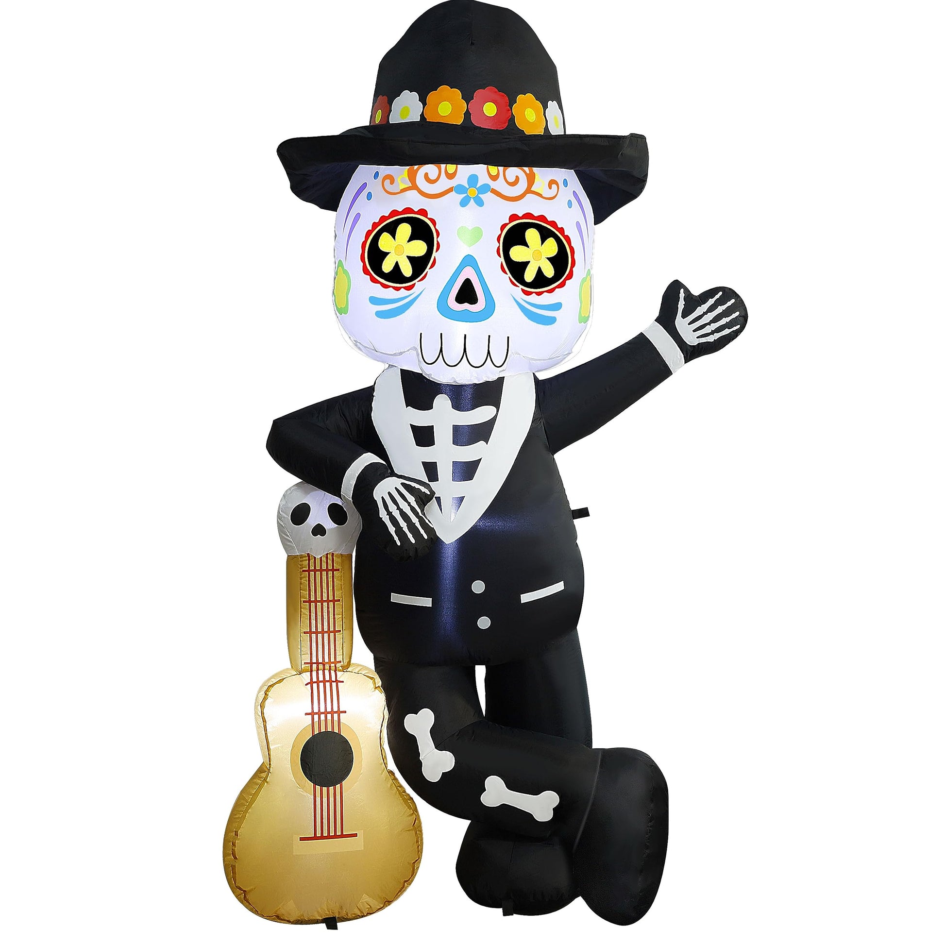- SKELETON HOLDING A GUITAR: The inflatable features a well-dressed skeleton holding a guitar as if he is giving a performance. The skeleton wears a formal suit and has beautiful face paintings with great Day-of-the-Dead Touch. Additionally, there is an endearing skull design at the top of the guitar.