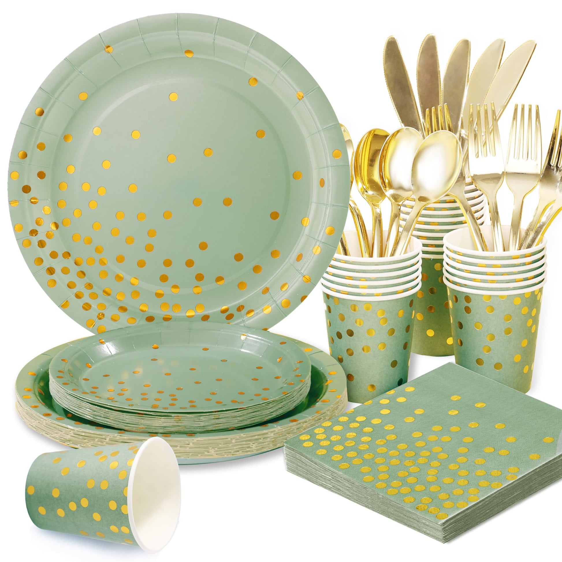 - 【Fresh Design】This green paper plates and napkins party supplies are designed with a sage green background and dotted with many attractive gold foil dots around, adding color to your table and bringing a fresh and natural atmosphere that will surely be loved by everyone, these sage green and gold plates will make your party vibrant