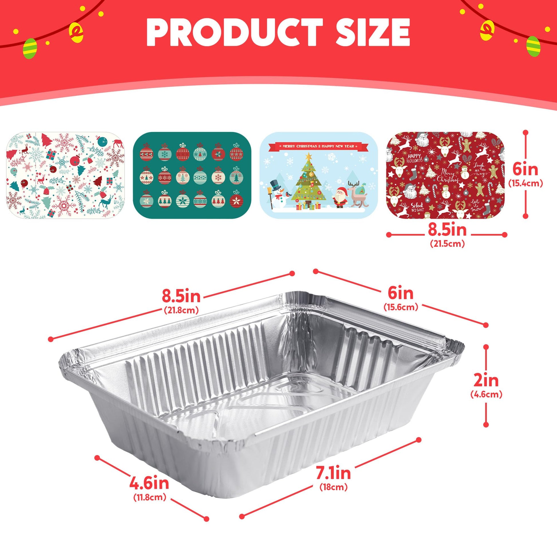 - Easy to Use. The Xmas foil containers with lids for food come with beautiful Christmas-themed lids that will make the perfect addition to your holiday presents! Each container measures 8.5"x6"x2", providing ample space for small storage needs or to go food containers for parties and gatherings.