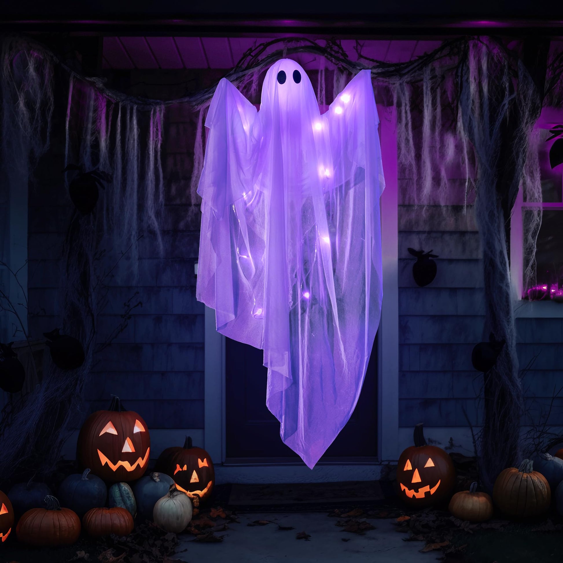 - REALISTIC HALLOWEEN DECOR: Our hanging ghost features a realistic appearance that is sure to impress your guests. With intricate details, such as a creepy purple light, it looks like it's ready to scare your guests, friends, and trick-or-treaters.