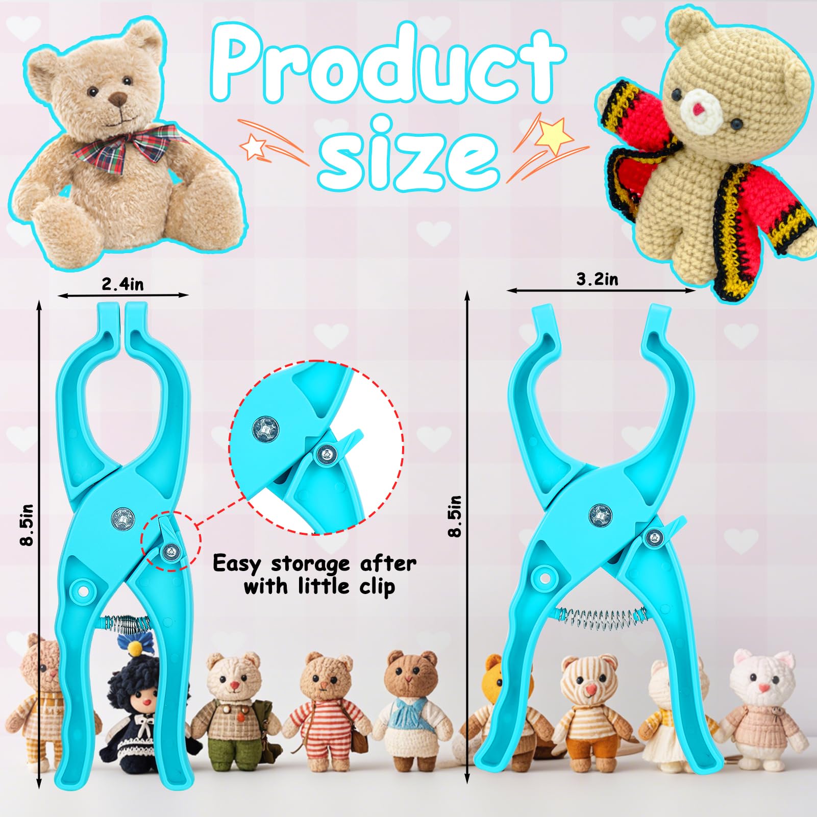 - Upgraded design : Our safety eye tool upgraded with a small tool attached on the hand board, it is suitable for 10-30mm safety eyes usually, but if you would like to attached 5-10mm safety eyes on doll, remove a small tool from hand board and attached it on tool for use (see the picture for details). In addition, it features a little clip on the hand board, clip to make the tool smaller for easy storage