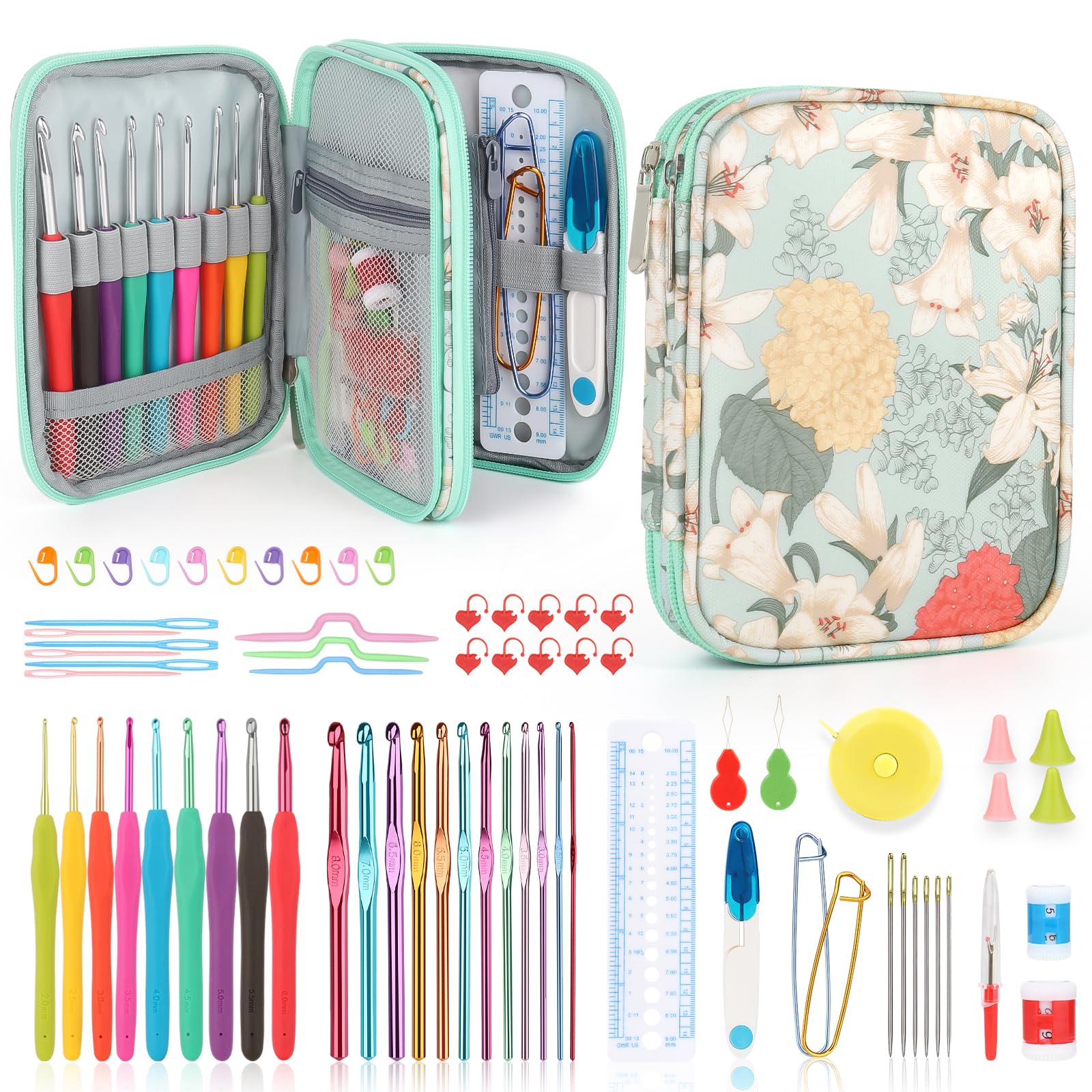 - The crochet hooks set (73 pieces) includes 9 x Crochet Hooks (2.0-6.0mm), 12 x Aluminum Alloy Crochet Hooks (2.0-8.0mm), 12 x Red Locking Stitch Makers, 10 x Locking Stitch Makers, 6 x Plastic Yarn Needles, 6 x Sewing Needles, 4 x Needles Point Protectors, 3 x Plastic Bow Shape Needles, 2 x Sweater Pins, 2 x Row Counters, 2 x Yarn Threaders, 1 x Measure Ruler, 1 x Yarn Remover Tool, 1 x Tape Measure, 1 x Scissors, 1 x Crochet Storage Case.