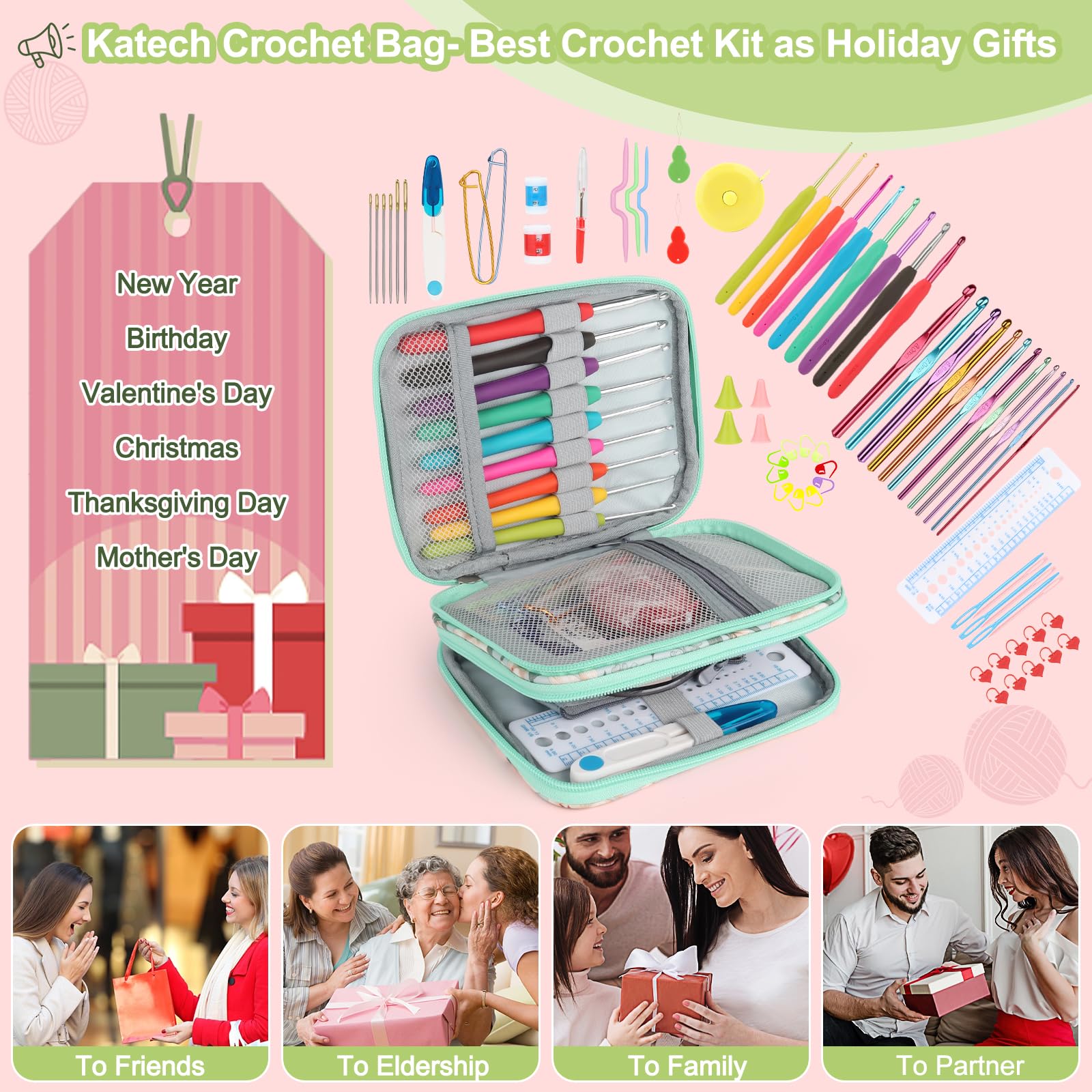 Katech Crochet Hooks Set with Crochet Case, 73 pcs Knitting Accessories Ergonomic Crochet Hook for Making Bag, Glovers, Sock, Colorful Soft Handle Knitting Needles Kits DIY Hand Tool