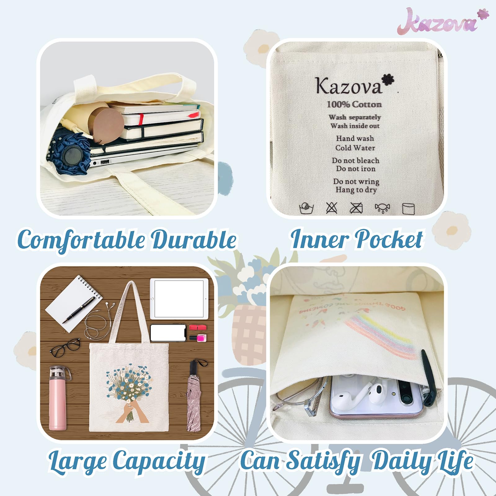 Kazova Aesthetic Flowers Cotton Canvas Tote Bag Blue Bouquet Bicycle Cloth Tote Bag Cute Cotton Tote Bag Art Canvas Tote Bag Reusable Shopping Bag for Gift