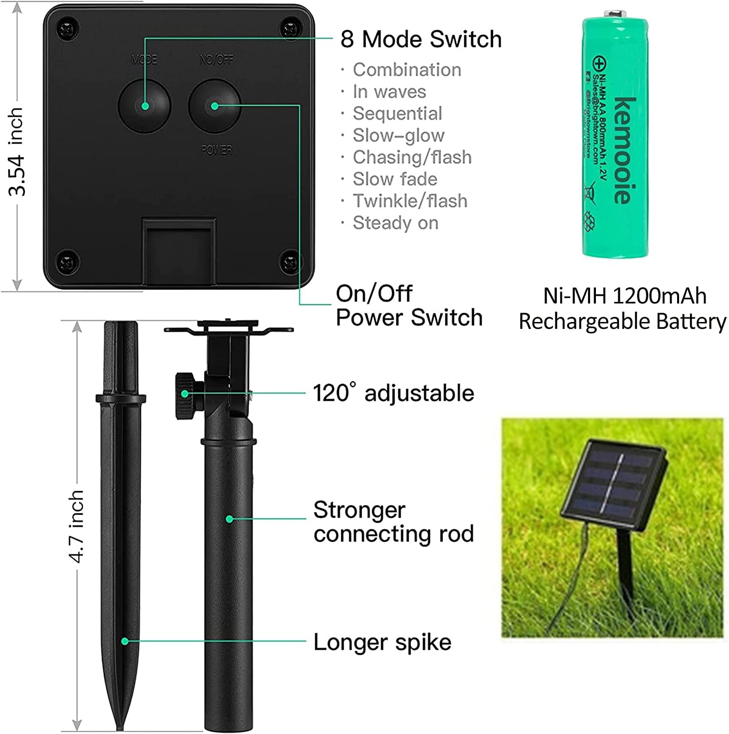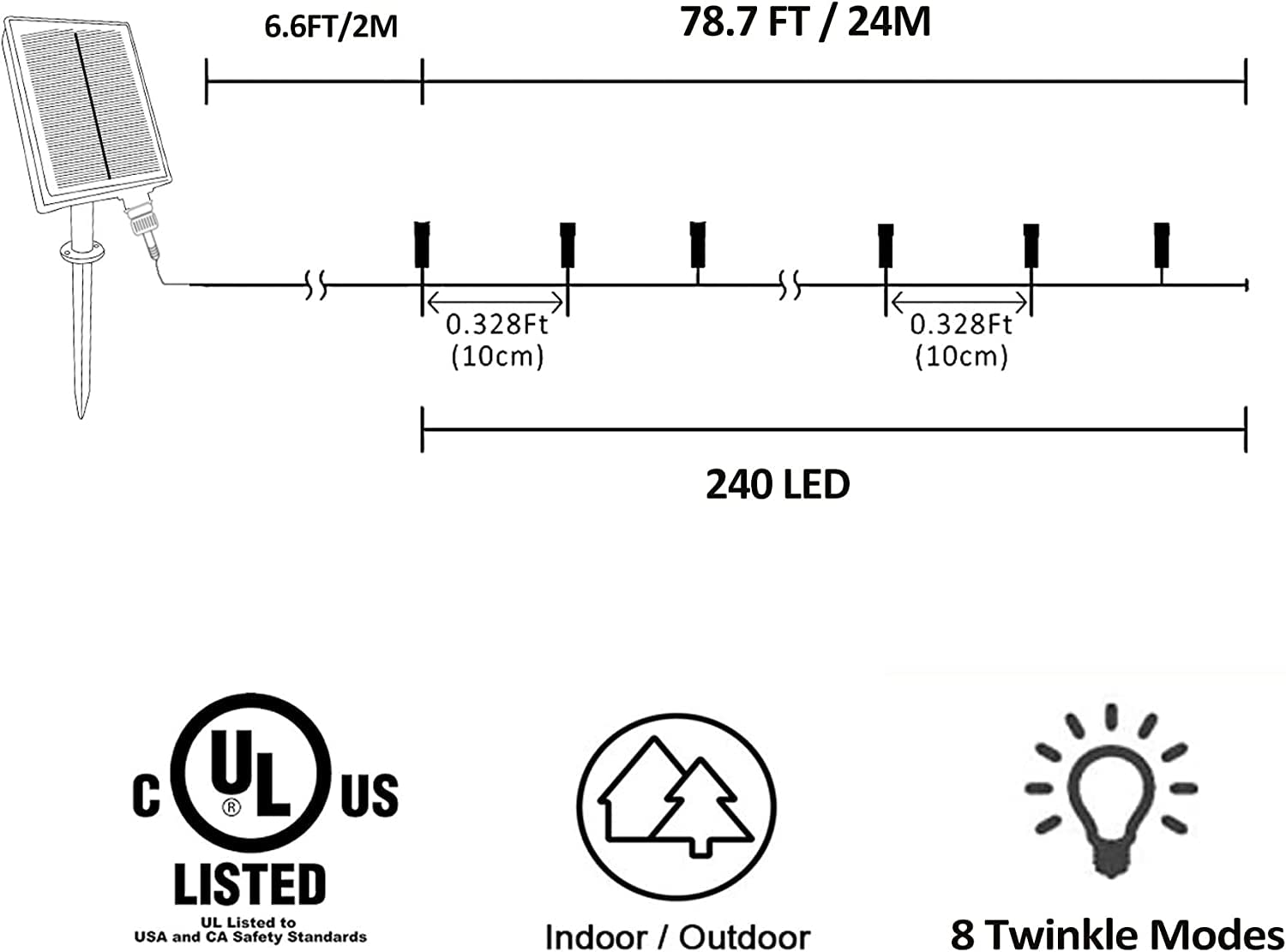 - UL Listed Safty & Easy Installation: Low voltage Solar Lights with UL certification. Flexiable wire enable it easy to hang and bend to any other objects. Just switch this solar fairy lights to ON mode for the first timne use, and then it would activate auto ON at dusk and auto OFF at dawn. With additional solar panel ground spike, this string lights can stand firmly in lawn or garden