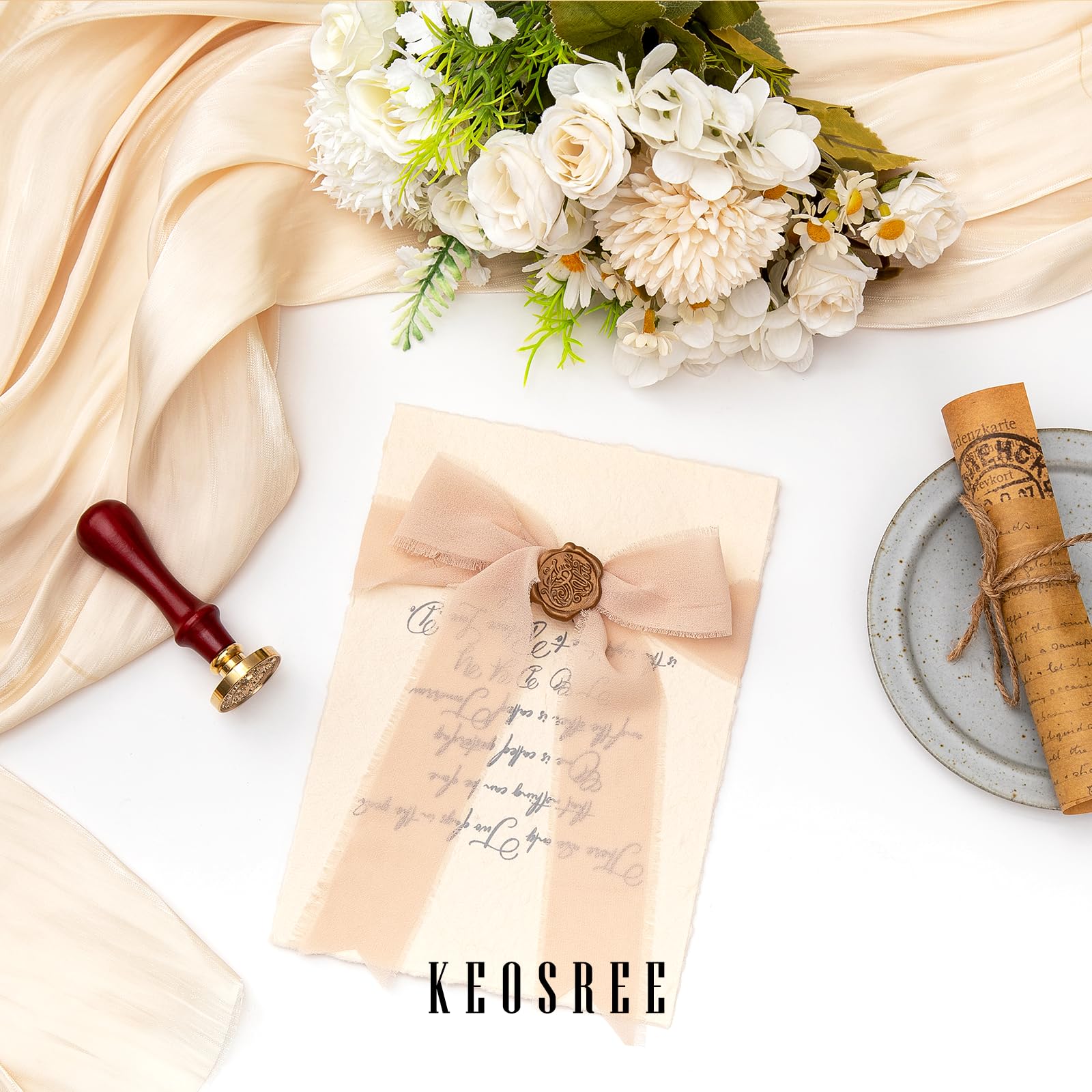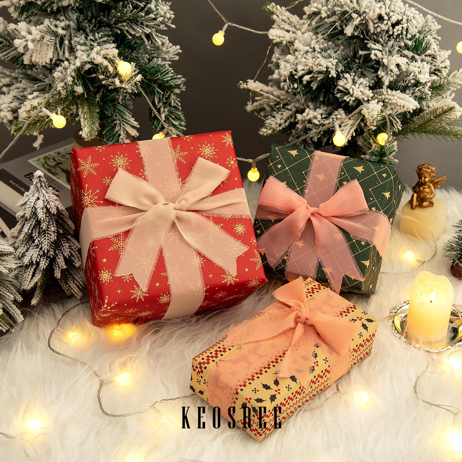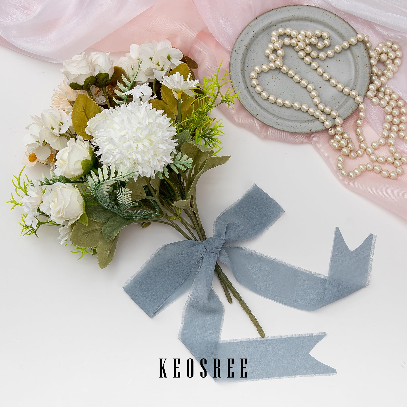 - đăPREMIUM MATERIALăKEOSREE Chiffon Silk Ribbon is made of polyester, smooth and soft touch, as light as silk. You can easily cut to make your decoration more advanced and exquisite.