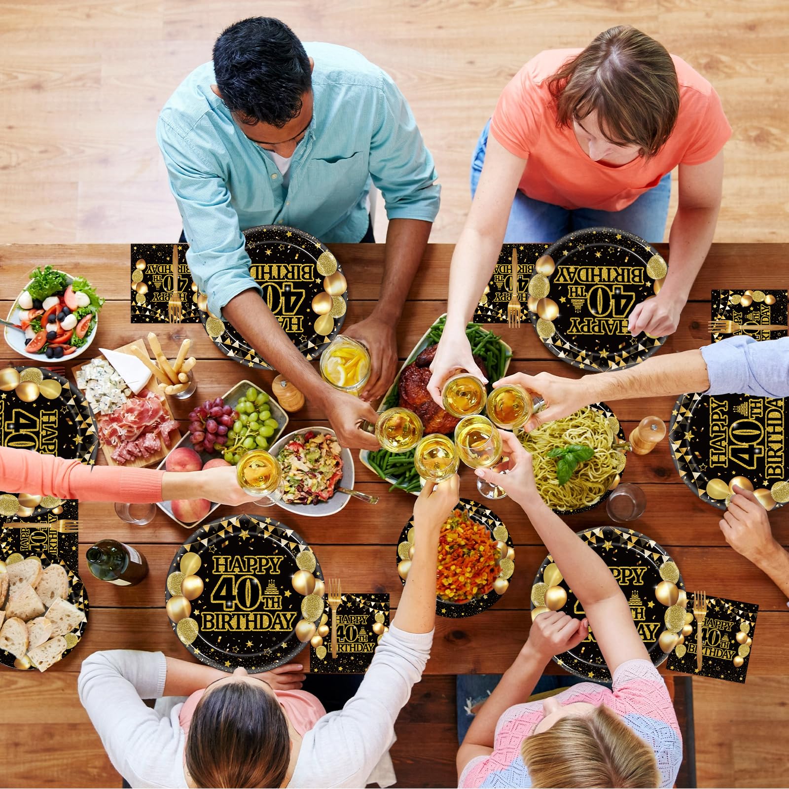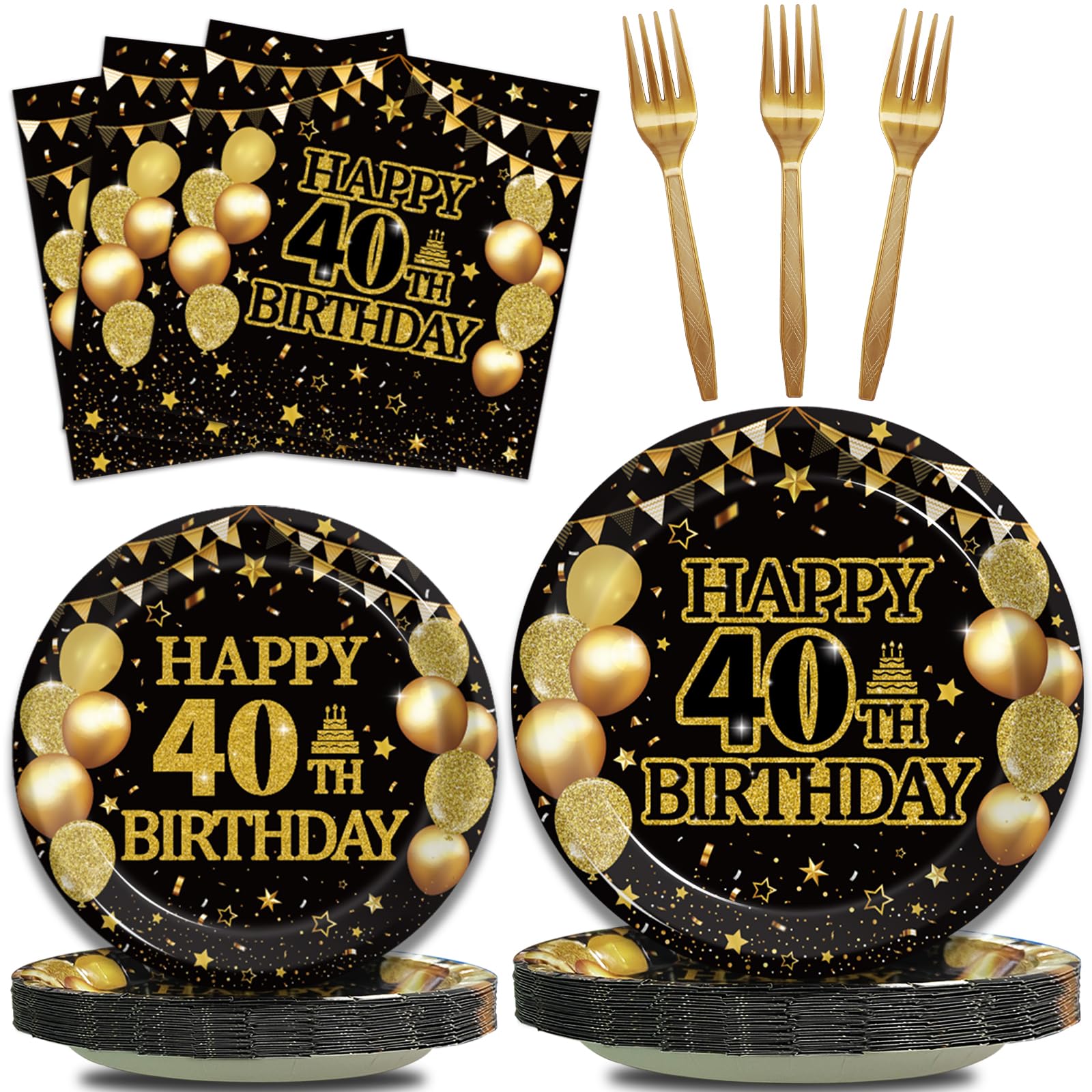 - Complete 40th Birthday Party Set: Our 40th birthday party tableware set includes everything you need for a party of 24 guests - 24 black gold birthday dinner plates (9''), 24 black gold birthday dessert plates (7''), 24 black gold birthday napkins (13''), and 24 black gold forks (6.5''). Perfect for hosting your 40th birthday party with ease