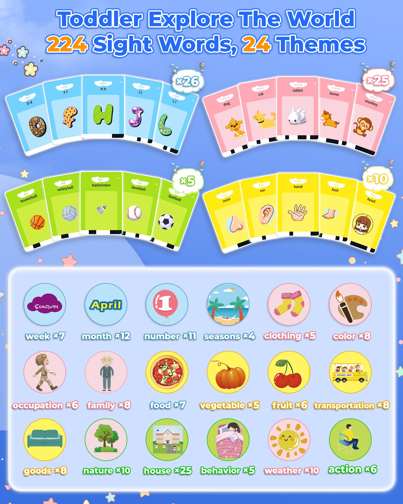 - 🌟Talking Flash Cards for Toddlers 2-5 Years: 224 sight words pocket speech for toddlers. The speech therapy toys for toddlers 2-5 will tell the words, and animals will make noises. Toddler flash cards can connect words with life, allowing babies to understand words deeply through visual and auditory sensory methods to explore the unknown of the world