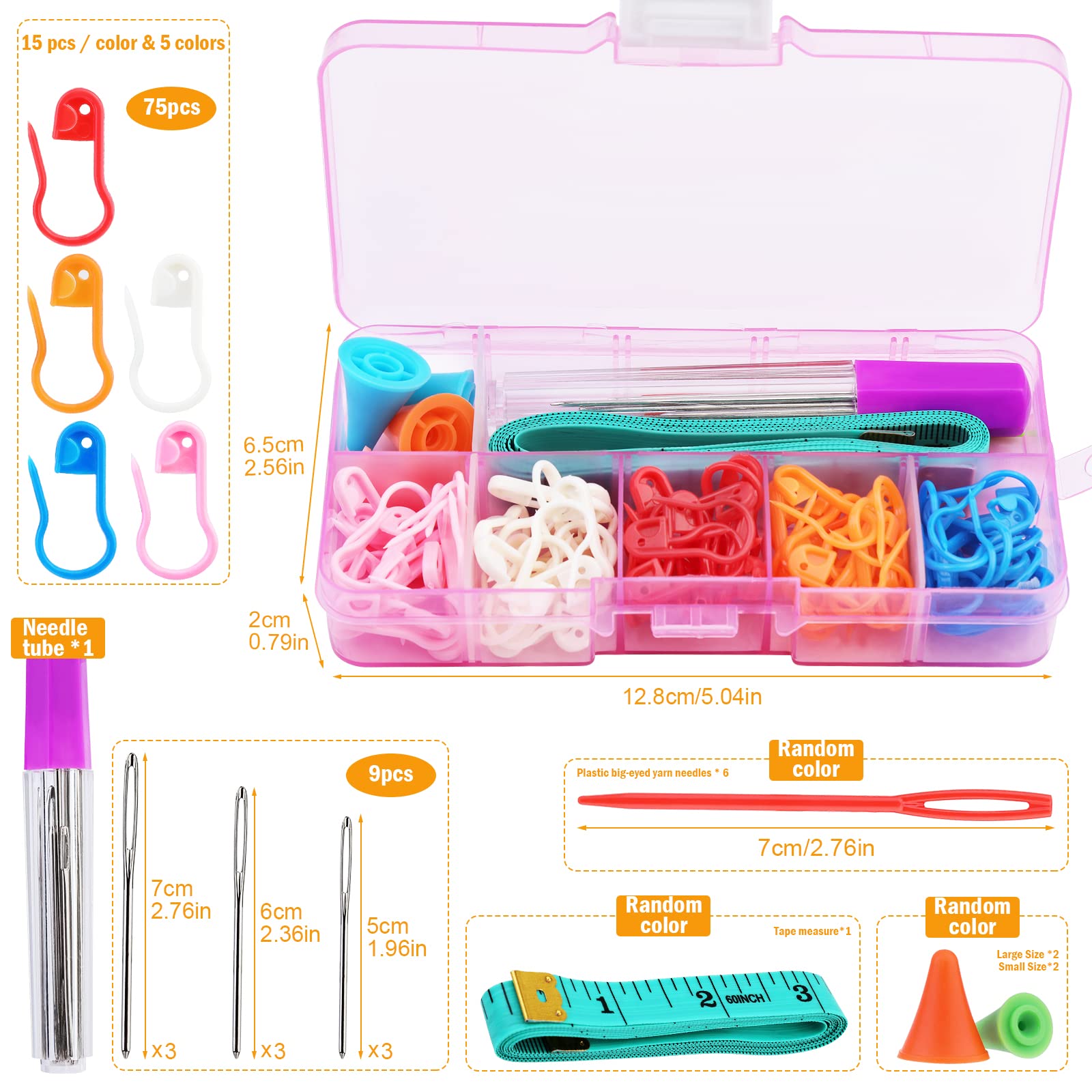 - STITCH MARKER KIT: This stitch markers kit provides you with a total of 75 pcs stitch markers, 9 pcs blunt hand sewing needles in 3 sizes, 6 pcs plastic big-eye hand sewing needles, 4 knitting needle stoppers in 2 sizes, 1 tape measure, 1 needle tube and 1 storage box.