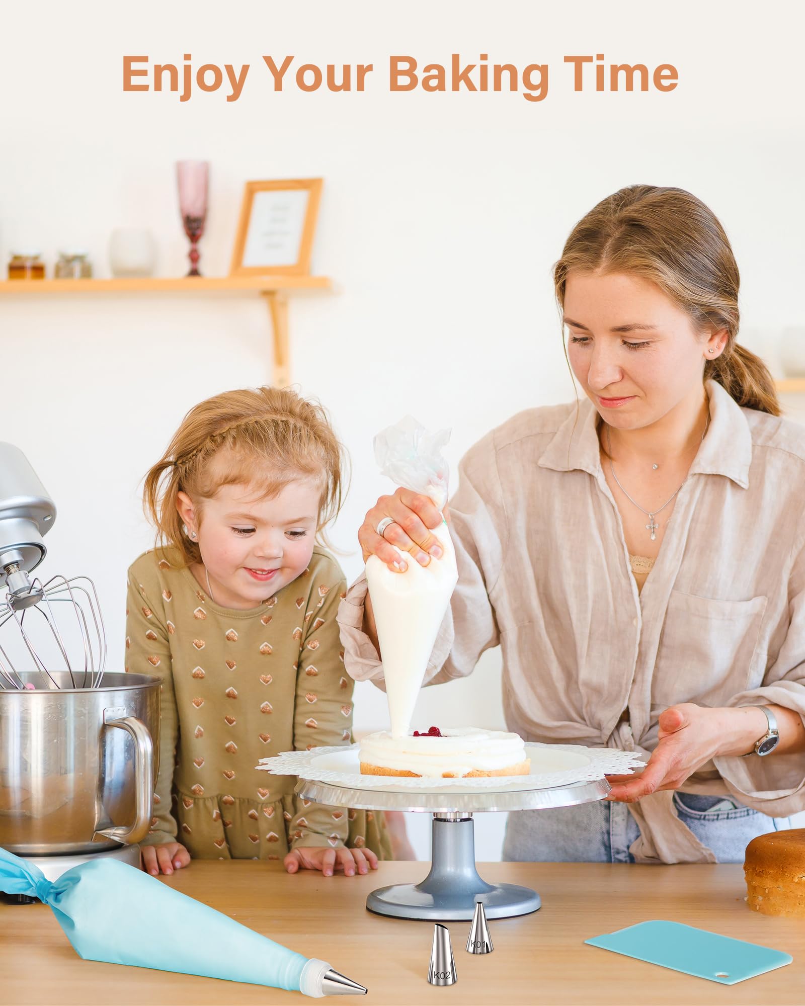 - Essential Cake Decorating Kit: 55 numbered stainless steel piping tips, 2 reusable piping bags, 20 disposable bags, 3 shapes of cake scraper, 3 reusable converters, 4 pastry bag ties, 1 scissor, 1 flower nail, and 1 tips brush. With these key baking tools, you'll be able to make cake decorating a piece of cake. Moreover, the User Guide is an eBook that has been carefully tailored to help you maximize your usage of this piping bags and tips set.