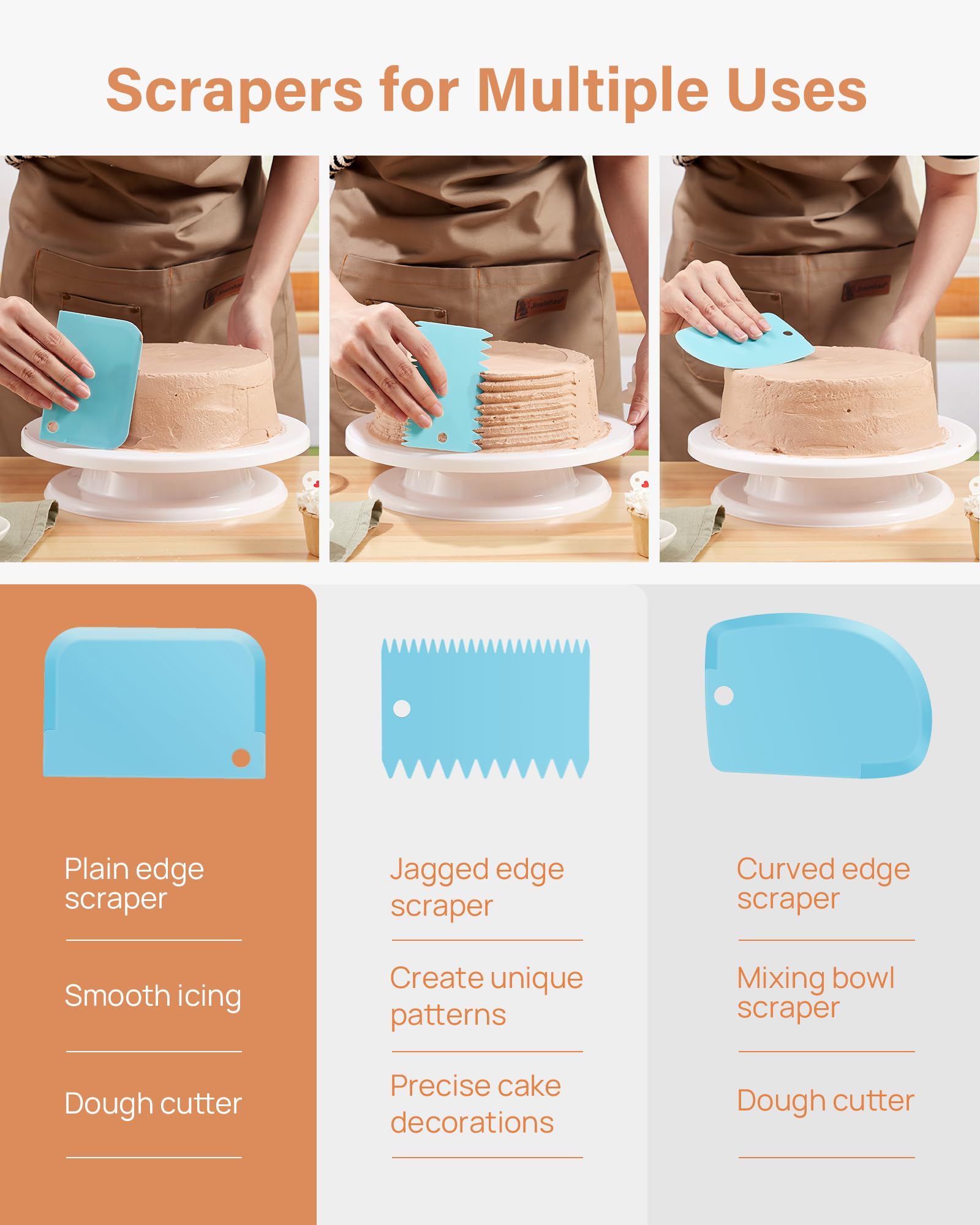 - 3 Edges of Cake Scrapers: The set has 3 different icing comb scrapers, so you can make various designs on your cake. With one rounded scraper, one straight scraper, and one toothed scraper, you can easily create complex and stunning designs.