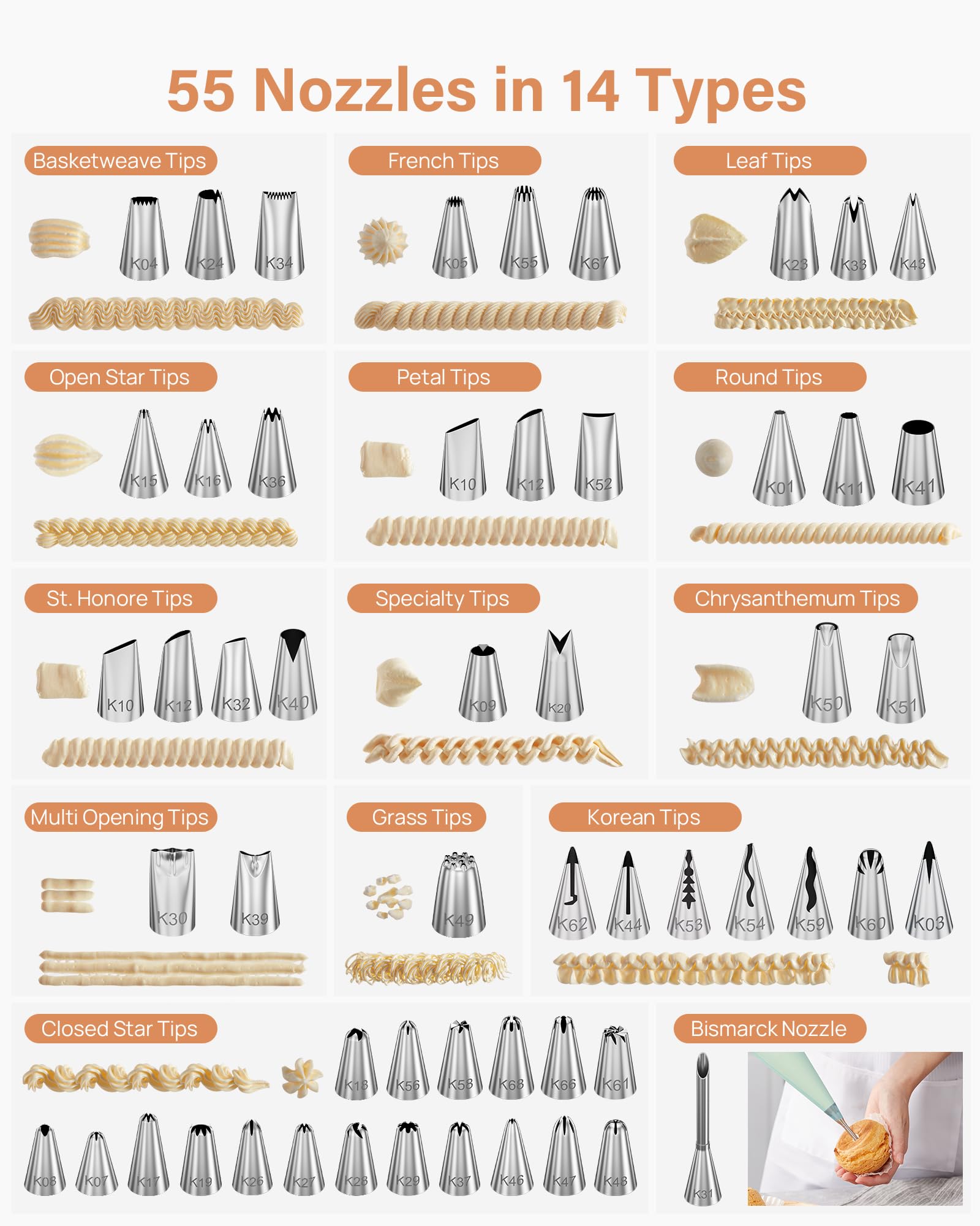 - Piping Tips with Different Patterns: 55 numbered piping tips offer various of patterns, including Closed Star, Opened Star, Round, and Specialty tips. Additionally, 3 couplers allow you to easily switch between tips without having to refill the bag.