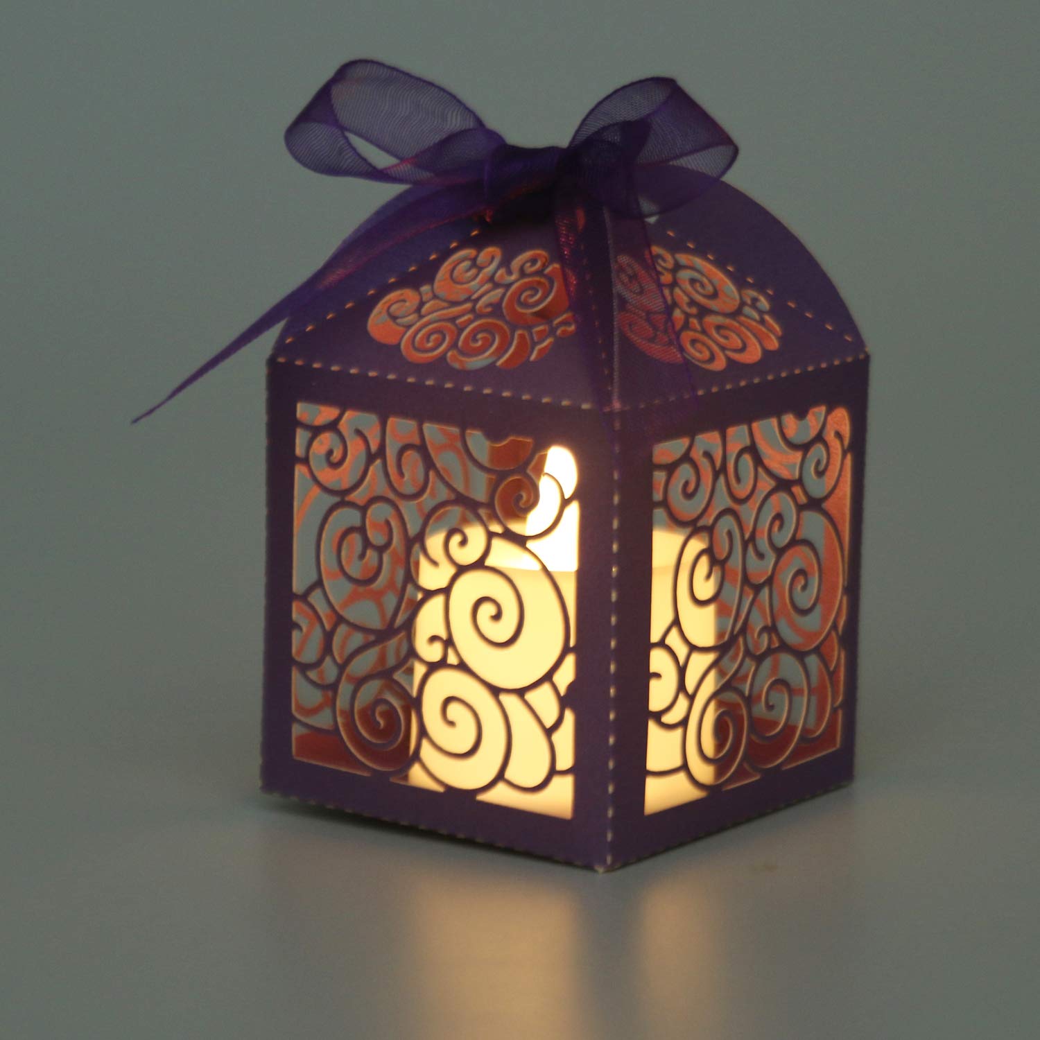 KPOSIYA 100 Pack Wedding Favor Boxes Laser Cut Boxes Party Favor Box Small Gift Boxes Lace Candy Boxes for Wedding Bridal Shower Baby Shower Birthday Party Anniverary with Ribbons (Purple, 100)