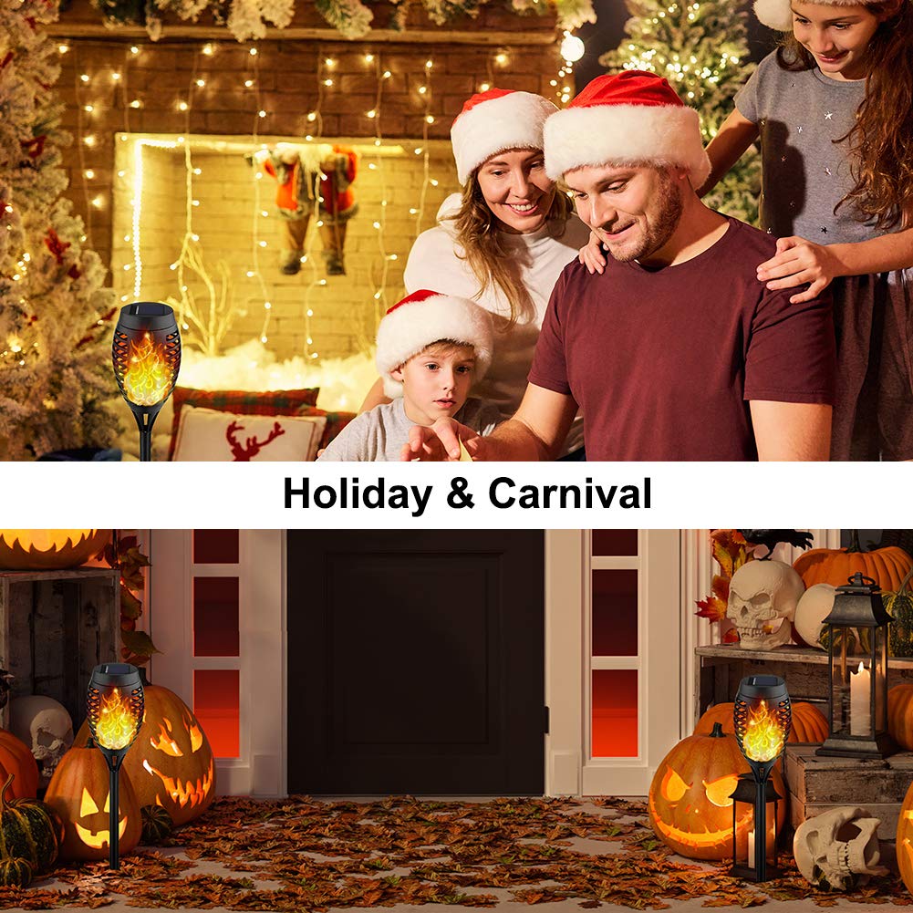 - TORCH LIGHTS FLICKERING FLAME: Solar outdoor lights flicker a soft and mod-enhancing "Real" flame for outdoor decorations for patio, garden, yard, porch, pool decor and for party, camping, barbecue, wedding, christmas, halloween decor.